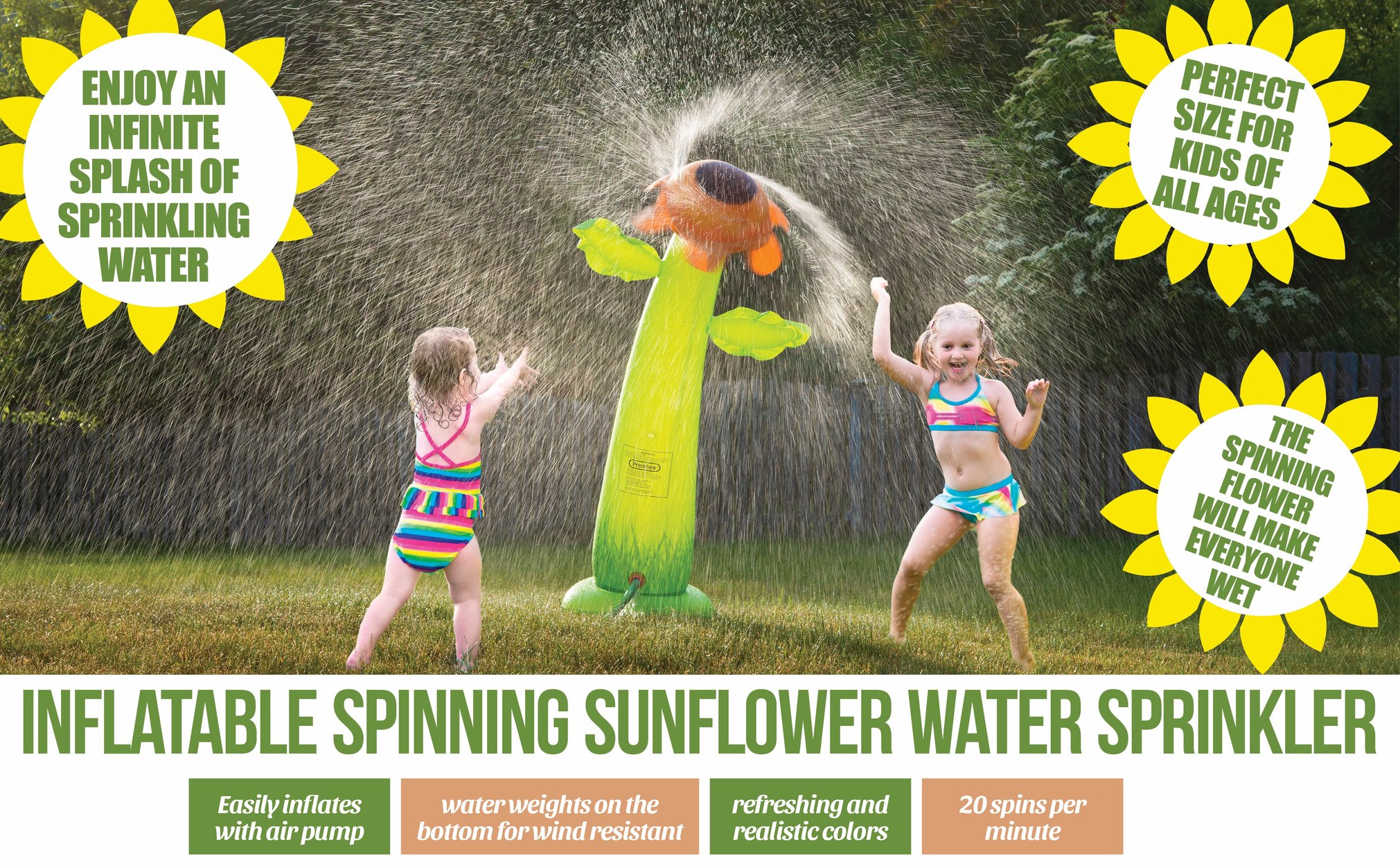 INFLATABLE DESIGN - Kids and adults alike will have fun with the splash-fun sunflower water sprinkler. This eye-catching inflating sprinkler has a beautiful sunflower design that lets it spin and spray water at different angles.