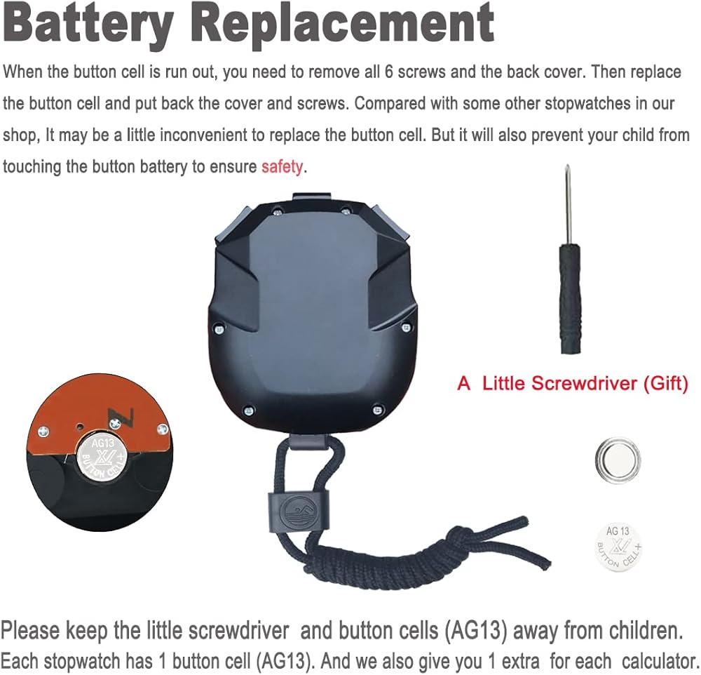 Precice Stopwatch and Spare Button Cell - Measure time at an accuracy of one hundredth of a second. Use the split time feature to precisely measure multiple events. Only powered by 1 AG13, and we offer 1 spare AG13 for each stopwach