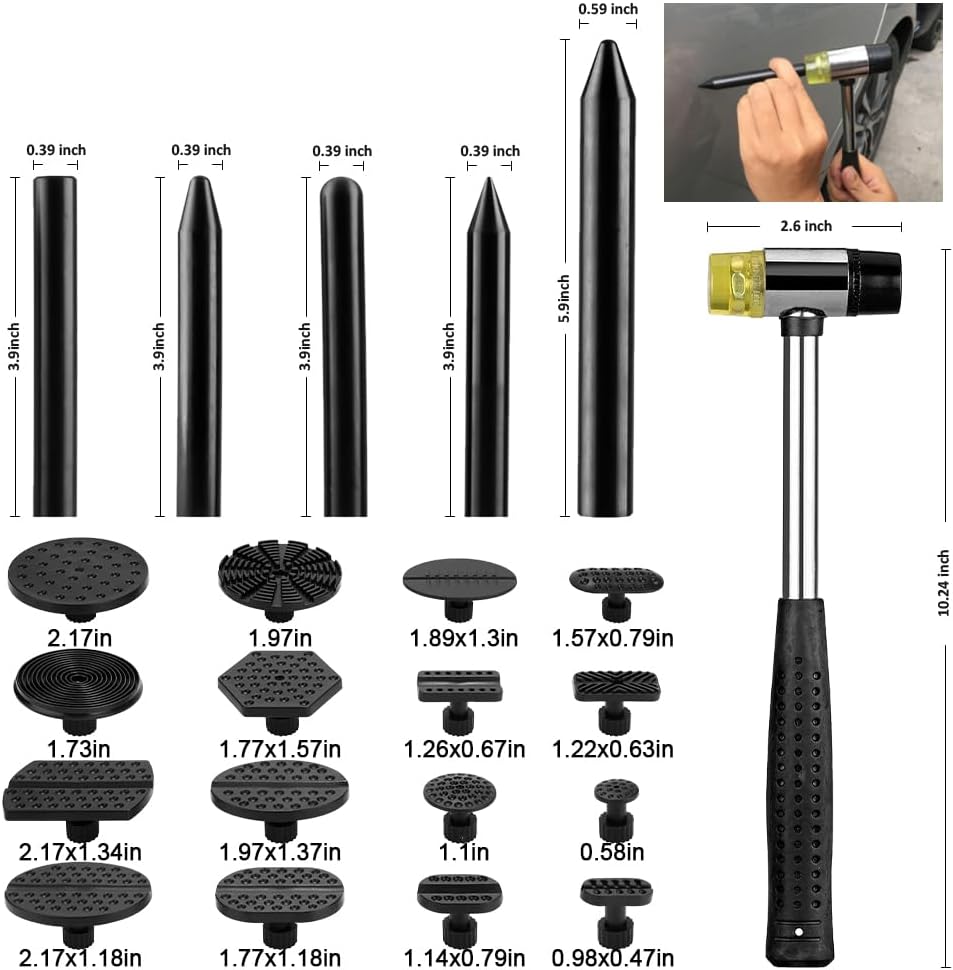 🚗Package Including: 1pc T-bar Dent Puller, 16pcs Black dent puller tab, 2pcs Red larger adjustable connector tabs, 1pc Hot glue gun, 10pcs Strong stickiness hot melted glue sticks, 1pc Rubber hammer, 5pcs Plastic tab down pen, 2pcs Glue shovels, 1pc Empty bottle, 1pc Black clean cloth, 1pc User's manual