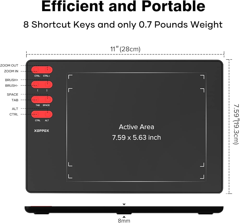 Lightweight and Portable - T505 computer drawing pads with 8 express keys to any shortcut combination of Windows OS prefer optimize your work flownd. Compact size (12” x 8”) with ideal working area (8” x 6”) is suitable for digital painting,handwriting, playing games and animation design, ONLY 0.7 Pounds in weight is more portable to carry to the office,school and travel,etc.
