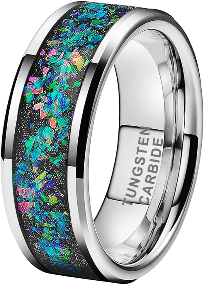 6mm 8mm Silver / Black Tungsten Carbide Rings for Men Women Engagement Wedding Bands Fashion Jewelry Genuine Crushed Galaxy Opal Beveled Edges Polished Shiny Comfort Fit.