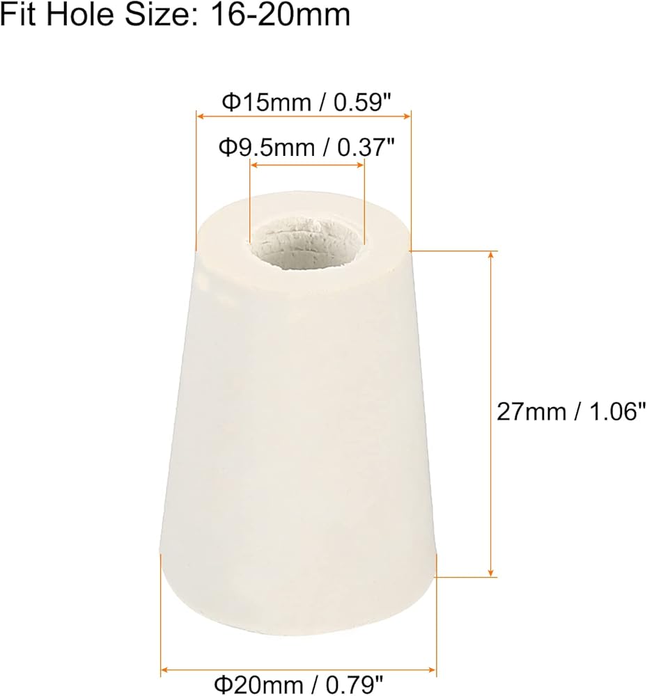 The tapered plug is in size of: Bottom Diameter: 17mm / 0.67 inch; Top Diameter: 23mm / 0.91 inch; Height: 27mm / 1.06 inch; Hole Diameter: 9.5mm / 0.37 Inch; Fit Hole Size: 18-22mm; In the package of: 5 x Rubber Tapered Plug