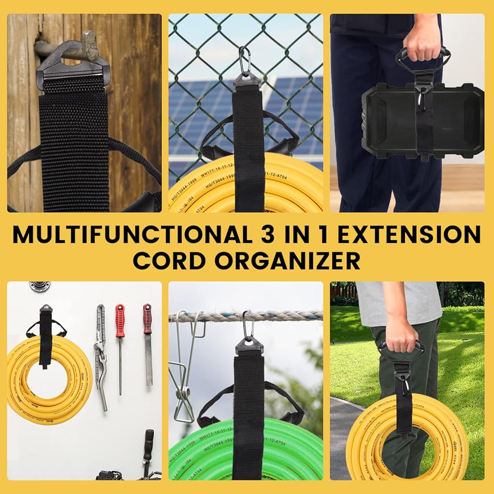 🎯 3-in-1 Function Upgrade; Compared to other single-function extension cord storage straps, Jumpso storage straps comes in 3 different usage, including Portable Carry Handle Style, Triangle Storage Style, Carabiner Suspension Style, to help you store, distribute and use extension cables.