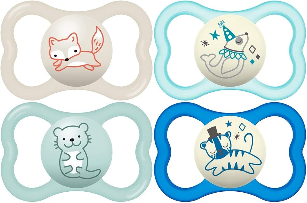 The MAM Air Day & Night Collection pacifiers for baby 6-16 months has a shield that is specially designed for babies with sensitive skin. The extra wide air holes allow plenty of circulation around your baby's mouth and even allow you to peek at their little smile. One pacifier in this pack has a special glow in the dark feature that helps keep your baby's silicone pacifier in sight without having to turn on the light and disturb their sleep. All MAM pacifiers feature our trademarked SkinSoft silicone nipples that feel like mom and help babies transition from being breastfed to using a pacifier. In fact, market research showed that MAM nipples are easily accepted by babies of all ages, with 94% nipple acceptance among babies tested*. The textured nipple stays easily in baby's mouth and is just the right size for your 6-16 months old baby so their growing teeth, palate, and jaw will be safe. Additionally, the symmetrical orthodontic nipple shape means you won't have to worry about uneven pressure or fussing to turn the pacifier "right side up". ** Market research 2010-2022, tested with 1,541 babies.
