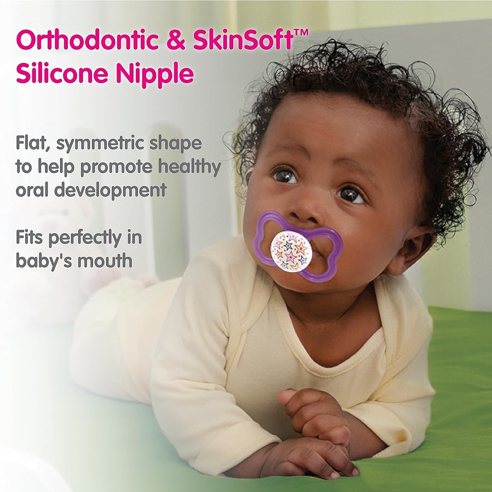 SYMMETRICAL SILICONE PACIFIER: The BPA-free silicone pacifiers for breastfed babies are made with our silky SkinSoft material and a symmetrical design that's ideal for jaw and teeth development.
