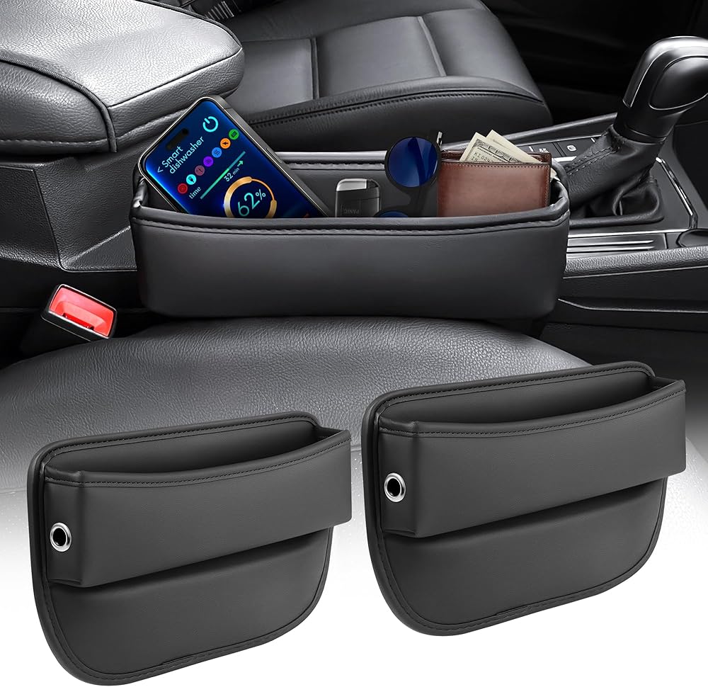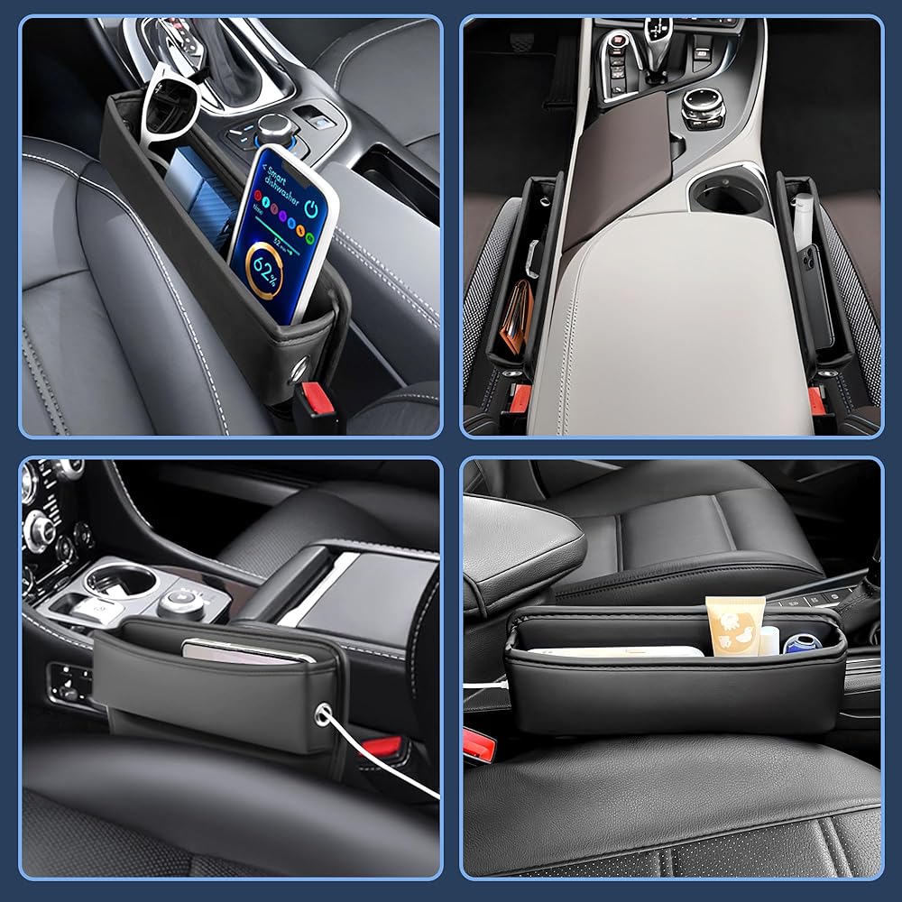🚗【2 Charging Cable Holes & Save Space】This car seat accessories has dedicated spaces for charging cables on both sides. The cables can easily pass through, allowing you to keep your phone securely stored while charging. With a space-saving style, our car seat organizer takes virtually no leg room in the seating area, allowing you to travel with ultimate comfort. The car accessories for women / men give a little extra storage for your front seat.
