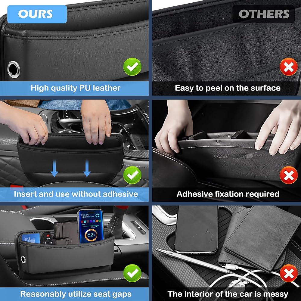 🚗【Premium Leather & Stylish Design】The car seat gap filler organizers are not only waterproof, but also adopts excellent leather on all sides including the back which gives them a luxurious feel. The surface of the seat gap filler is soft and comfortable and not easy to wear. The gap filler for car seat is versatile and can be used on both the driver and passenger side of the car. Instead of plastic, soft PU leather ensures that your seat leather remains unscathed and unmarked.