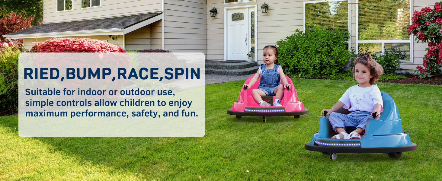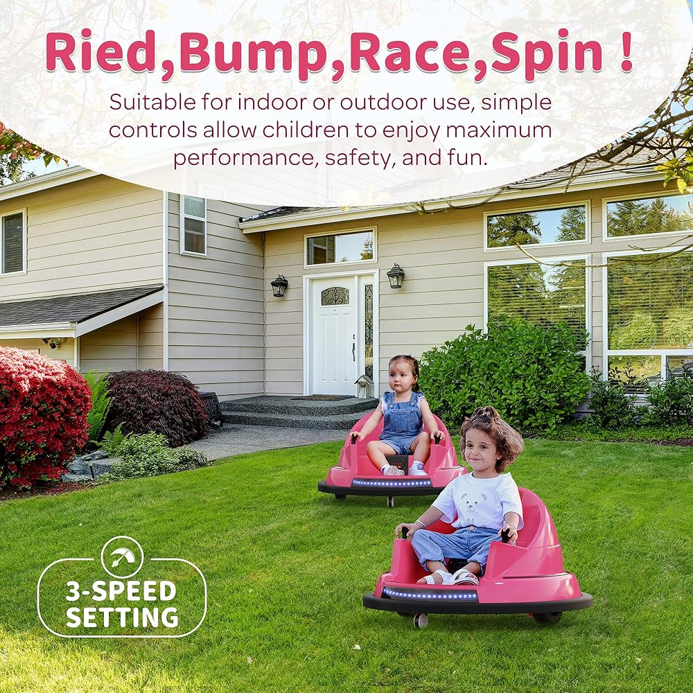 𝟑𝟔𝟎 𝐃𝐞𝐠𝐫𝐞𝐞 𝐑𝐨𝐭𝐚𝐭𝐢𝐨𝐧- Featuring adjustable 3-speed settings (1.25-3.1 mph) and the capability to spin a full 360°, our bumper car promises a whirlwind of joy. It glides effortlessly around obstacles, sparking endless giggles and laughter. Perfect for toddlers and children aged 1.5 years and older, it supports up to 66 pounds.