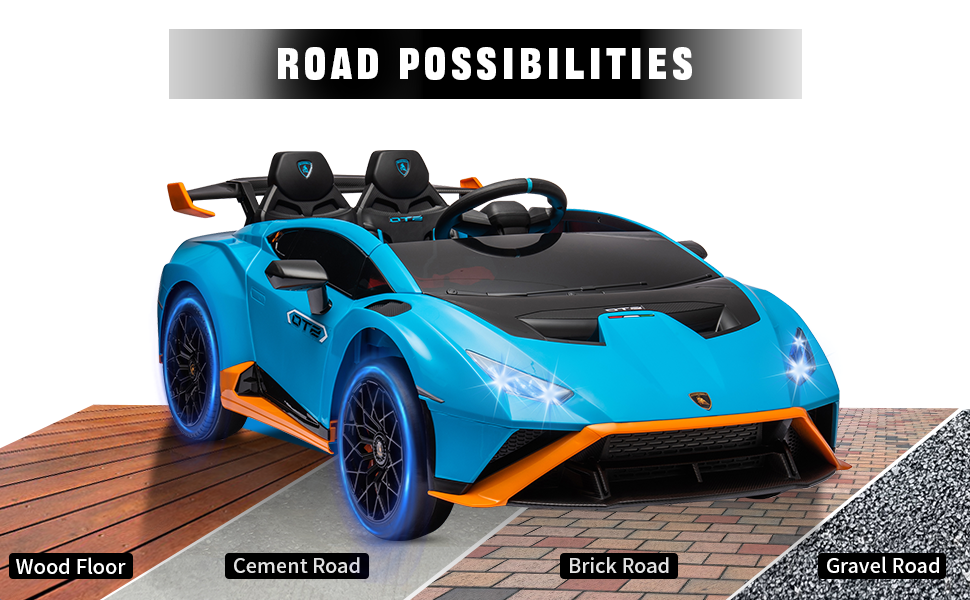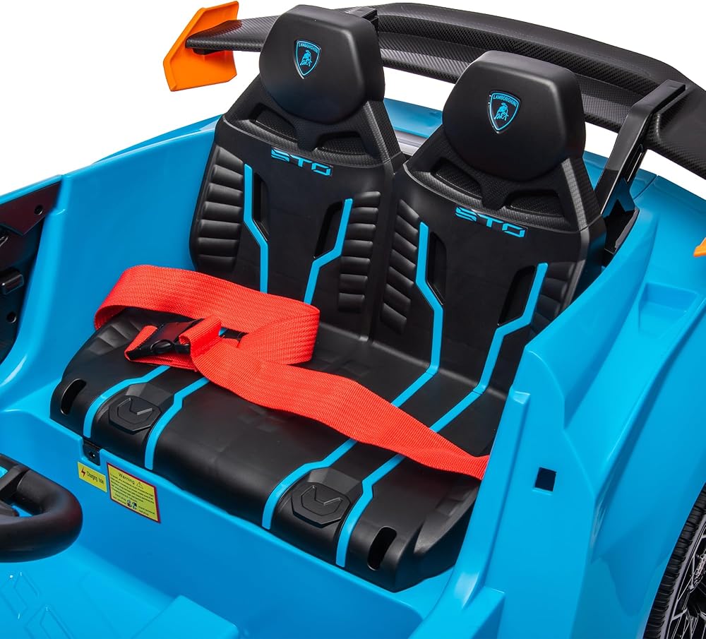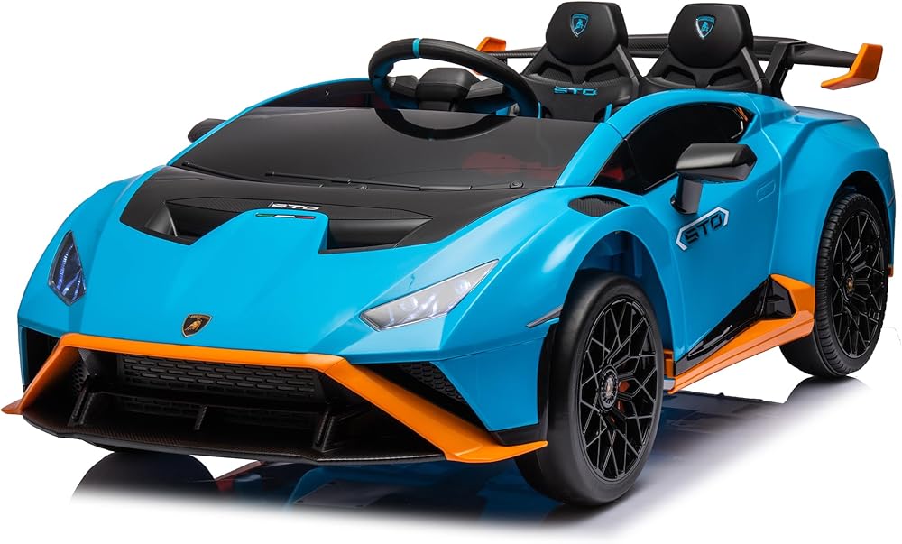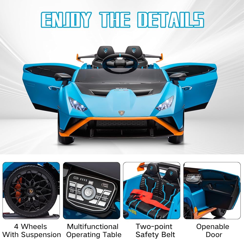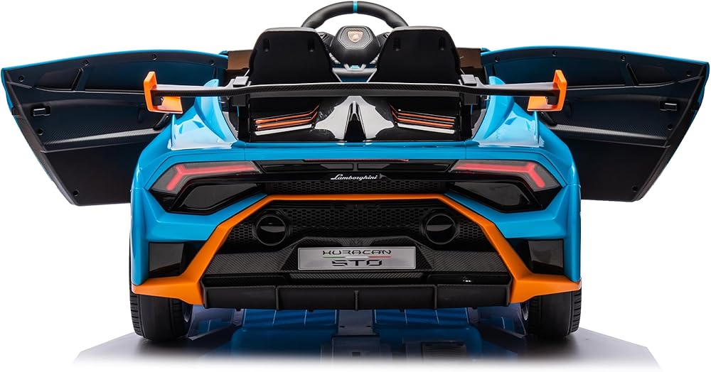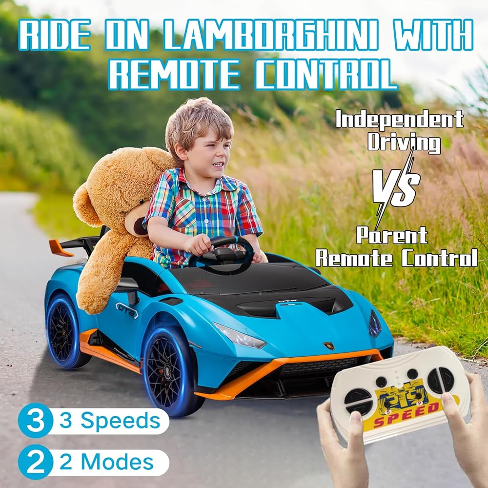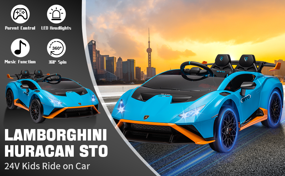 Lamborghini Huracan STO, 24V Kids Ride on Car, Electric Car for Kids with Remote Control, Two Speed Adjustable, Ages 3-8, Foam Front Wheels, 360° Spin, LED Lights, Music, USB, Drift Feature, Blue