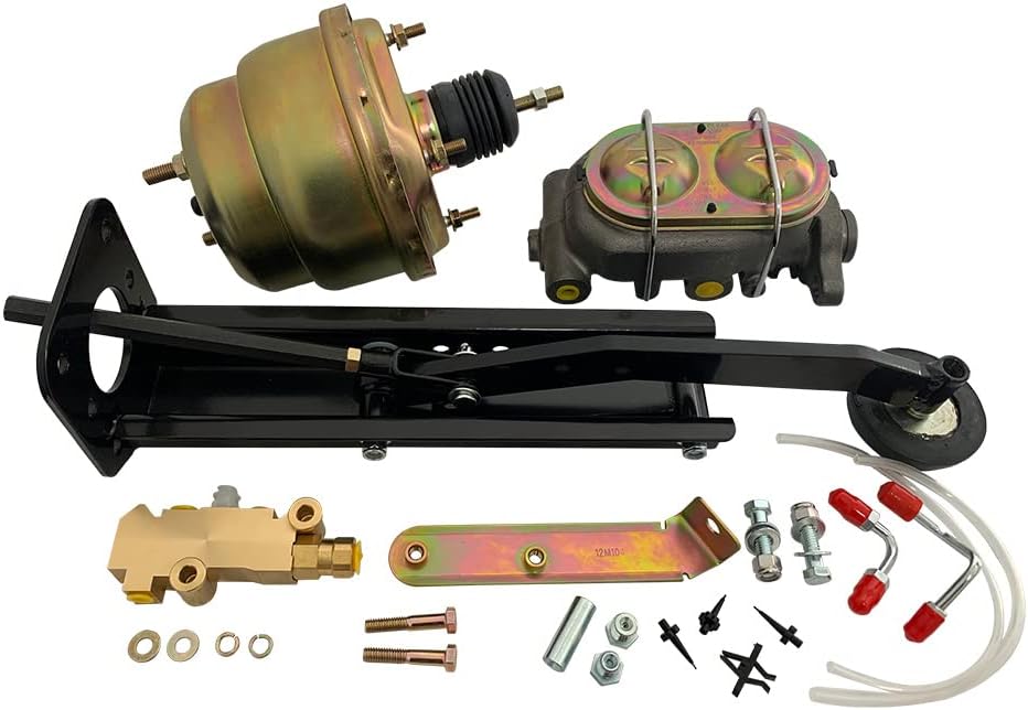 Complete package includes universal firewall mounted pedal assembly, 7" dual booster with a sleek zinc finish, and 1" bore GM cast iron master cylinder with 9/16" and 1/2" ports on each side!