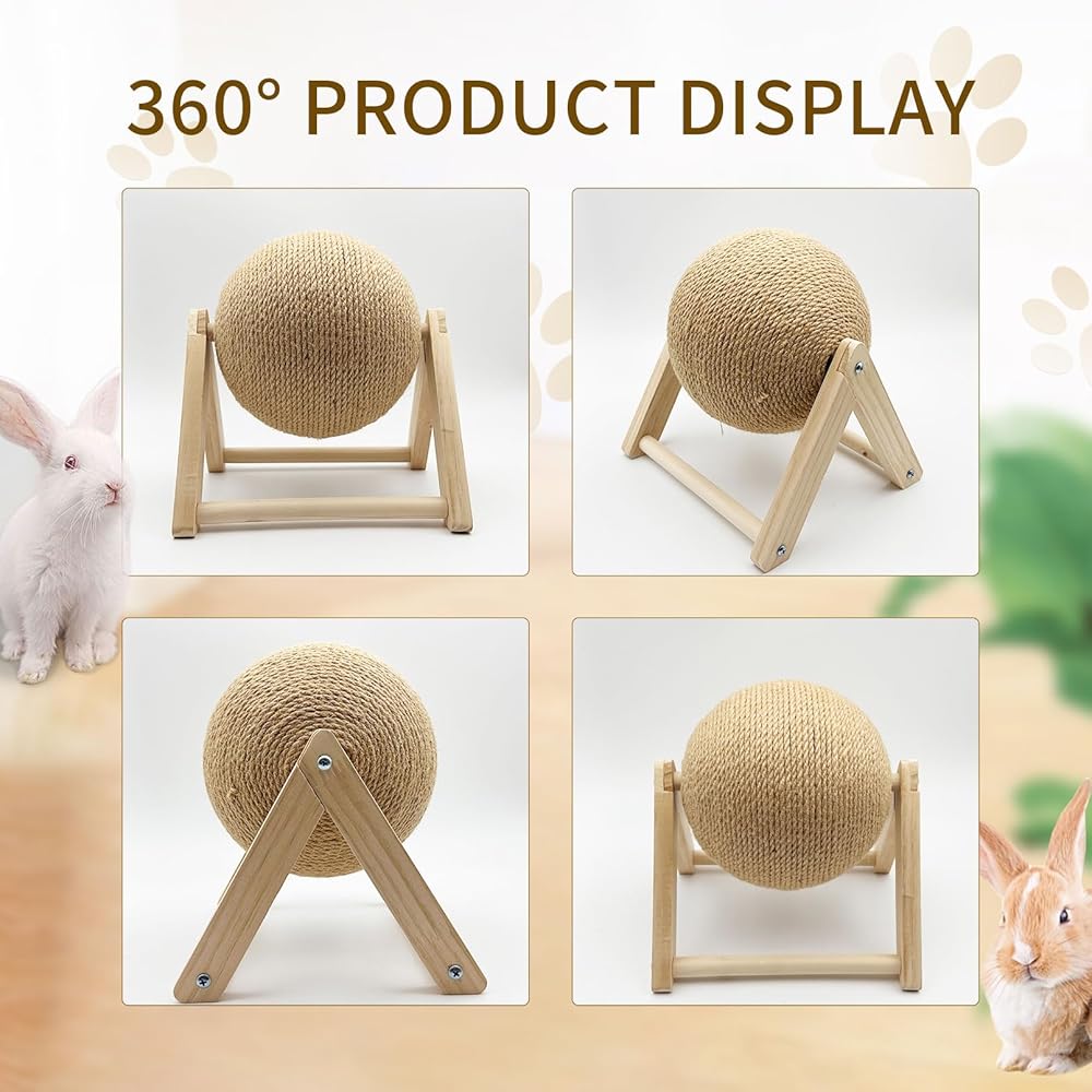 💯【Natural Safe Material】- Rabbit scratch toy is made of natural sisal, safe and reliable, the ball surface is tightly wrapped with sisal rope, wear-resistant and not easy to break. Solid wood brackets and bases provide stability and are not easy to tip over, providing a safe and durable claw grinding gifts for your pet bunnies.
