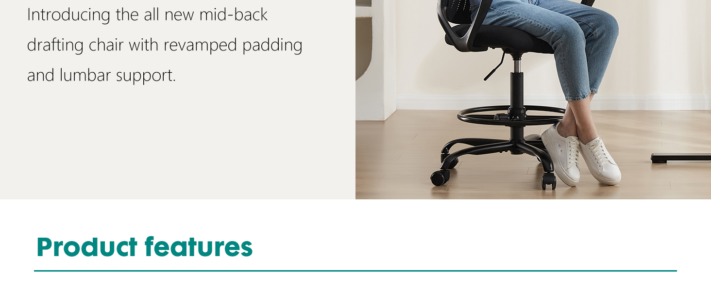 【Sturdy Chair】The sturdy structural design and metal five-legged base make this counter height office chair very strong with a load capacity of up to 250lbs. Durable wheels are suitable for wood floors, carpets, and tile.