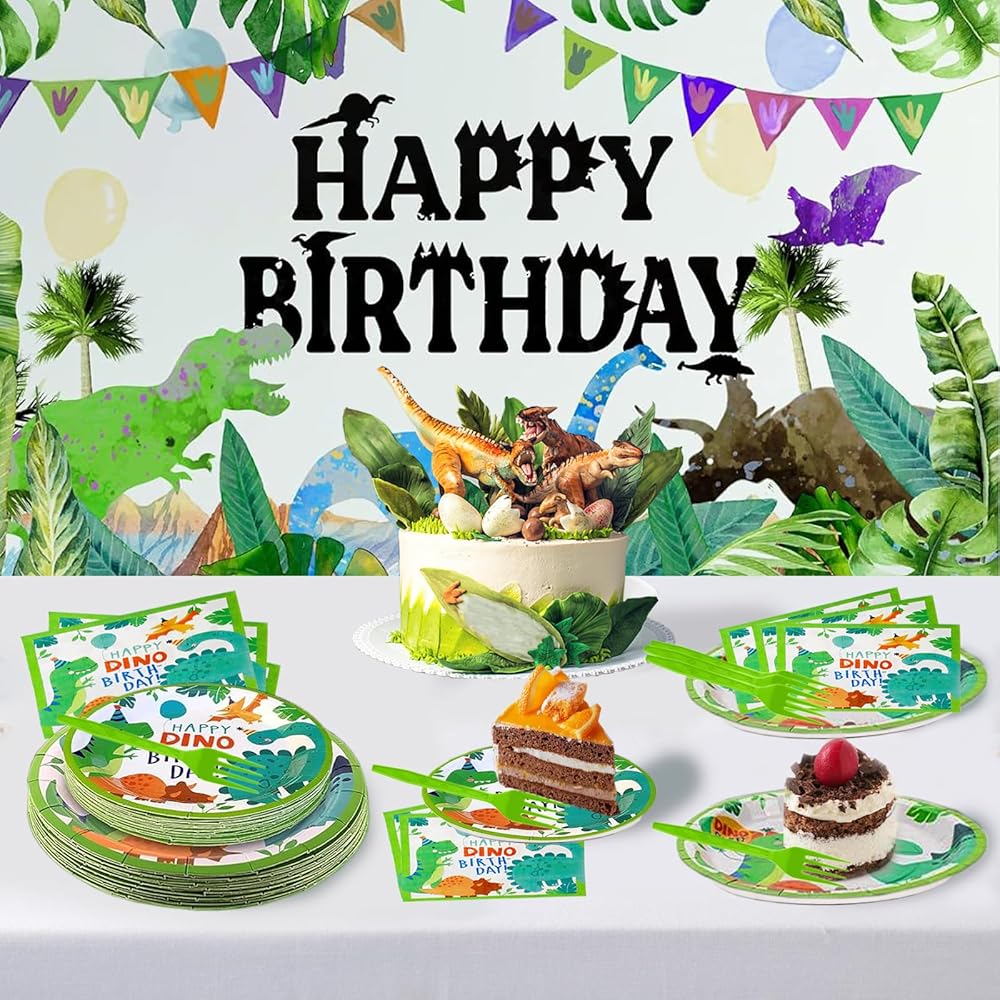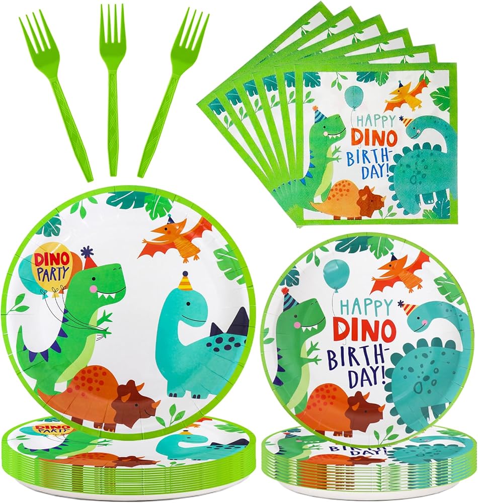 【Dinosaur Birthday Party Supplies】: This dinosaur themed party set includes all the necessary items to accommodate 24 guests, consisting of 24 x 9-inch plates, 24 x 7-inch plates, 24 napkins, and 24 forks.