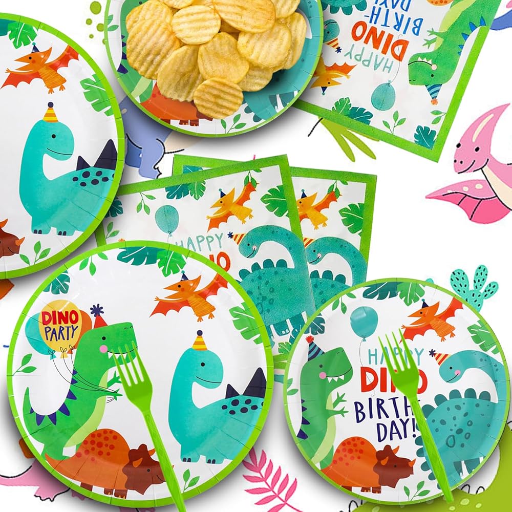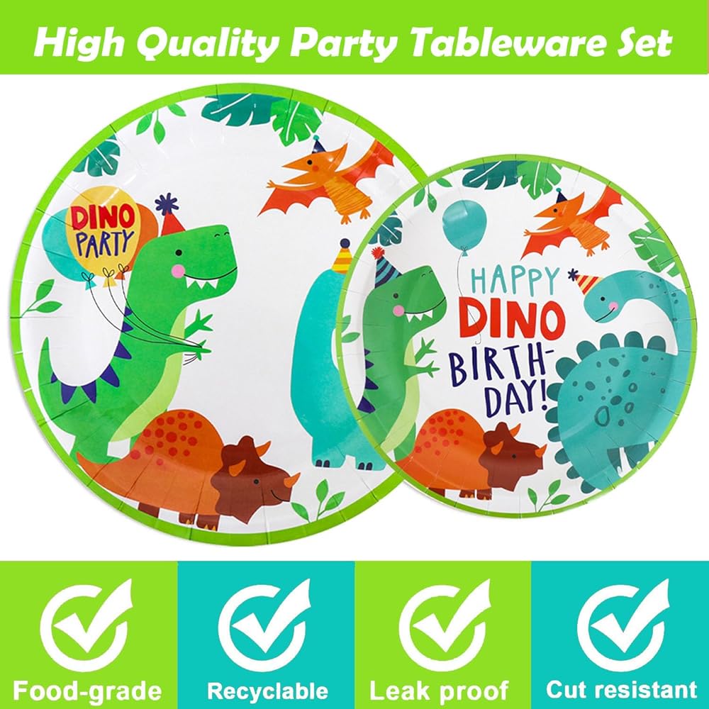 【Dino Theme Design】: The distinctive cartoon style featured on our dinosaur plates and napkins adds a playful and appealing touch to your party decor. Decorating your party with cartoon dinosaur party supplies will be an excellent choice.