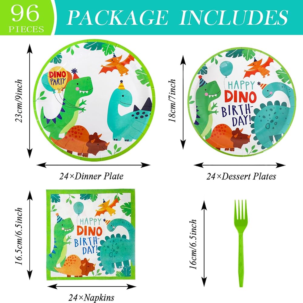 96 Pcs Dinosaur Party Supplies, Dinosaur Theme Birthday Party Decoration Includes Plates Napkins Forks, Dino Tableware Set for Birthday, Serves 24 Guests