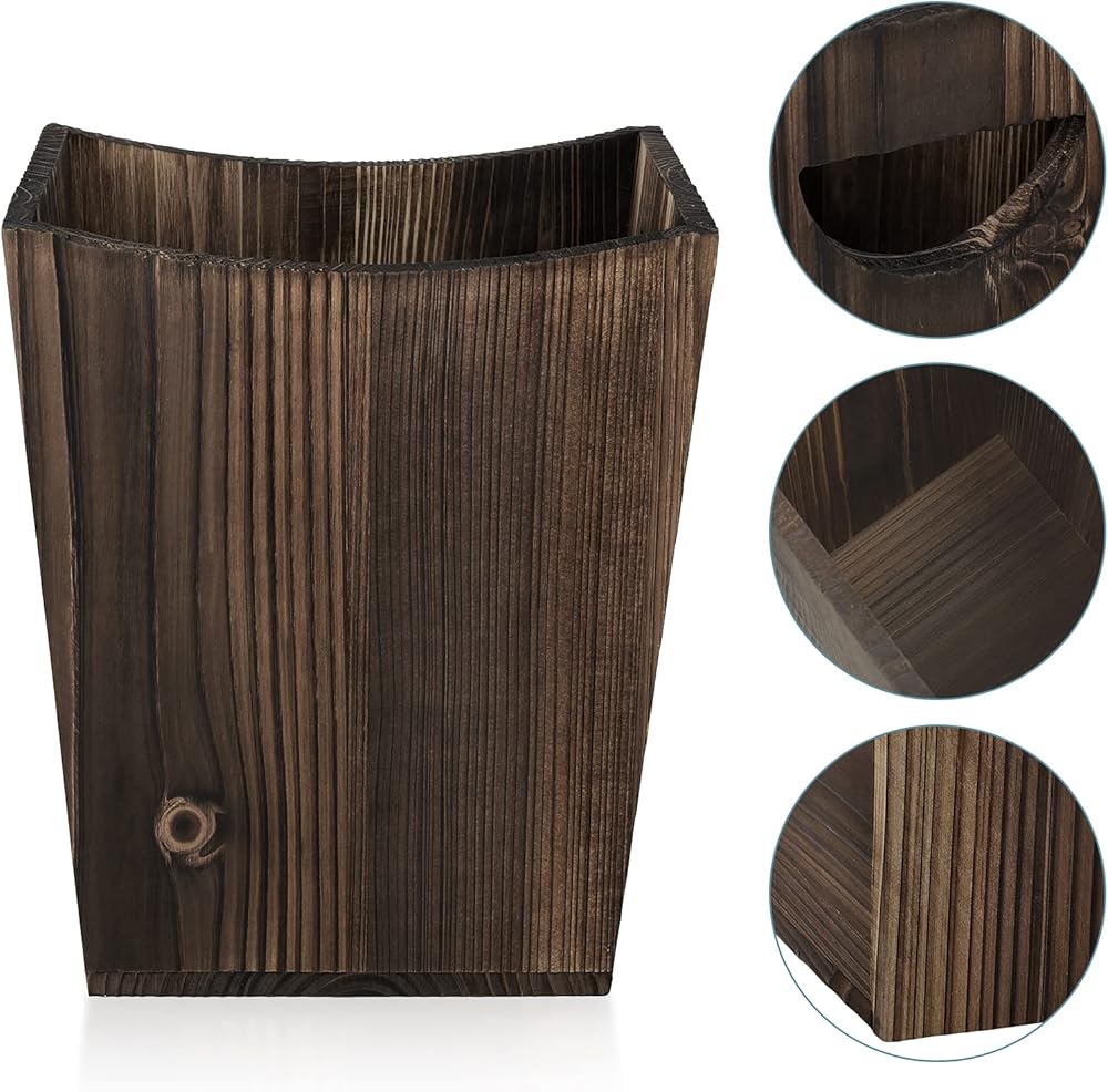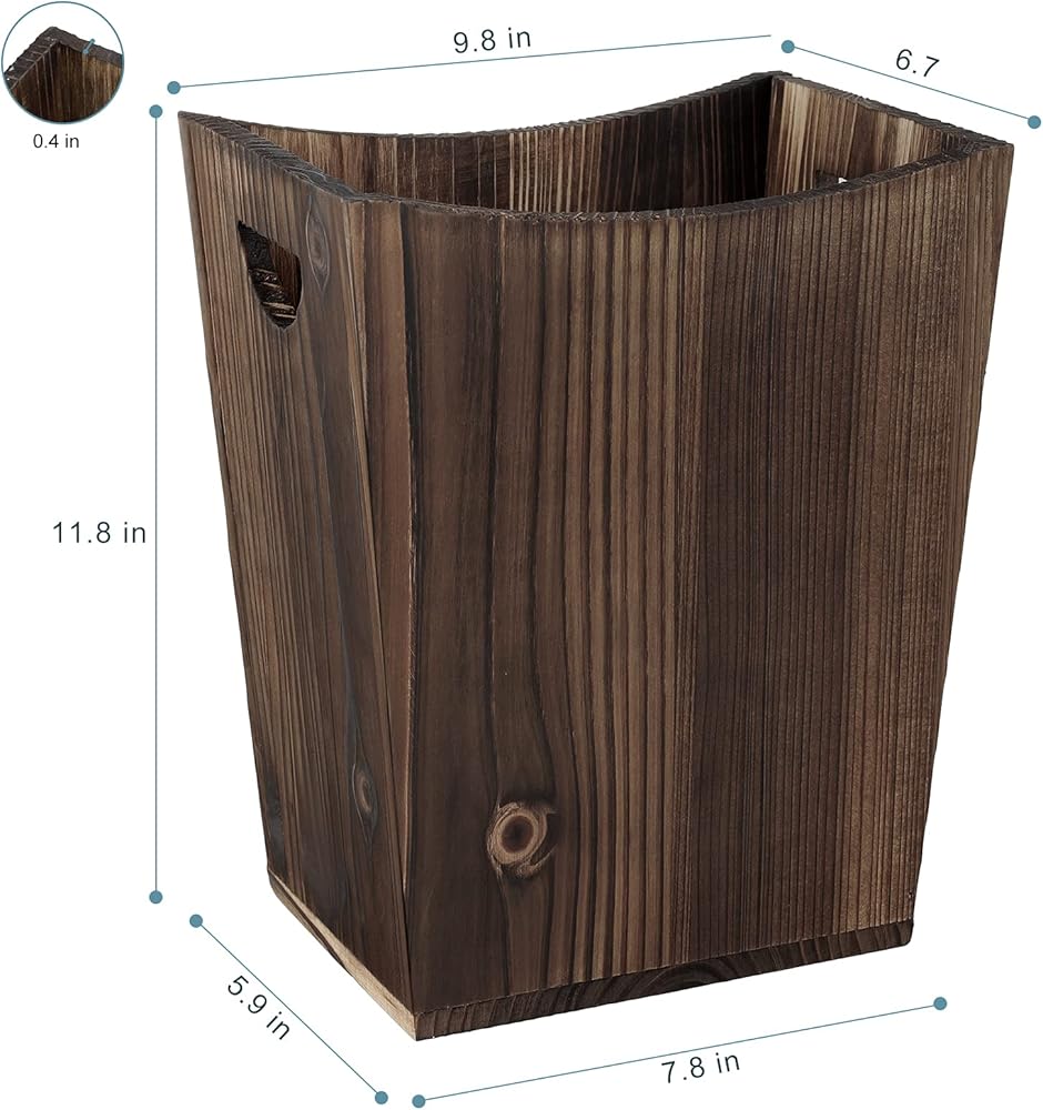 【SMALL WASTE BASKET】: Measure 9.84 x 6.69 x 11.8 inches. You can place it anywhere you need it. The rectangular trash can wastebasket wood only occupys small space in the office, kitchen, bathroom, etc. Though it has the compact size, the wide opening design makes it easier to throw garbage and be placed under the desk.