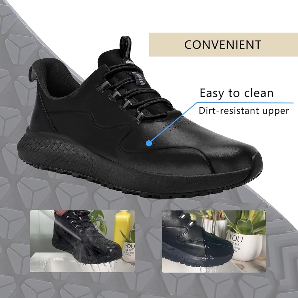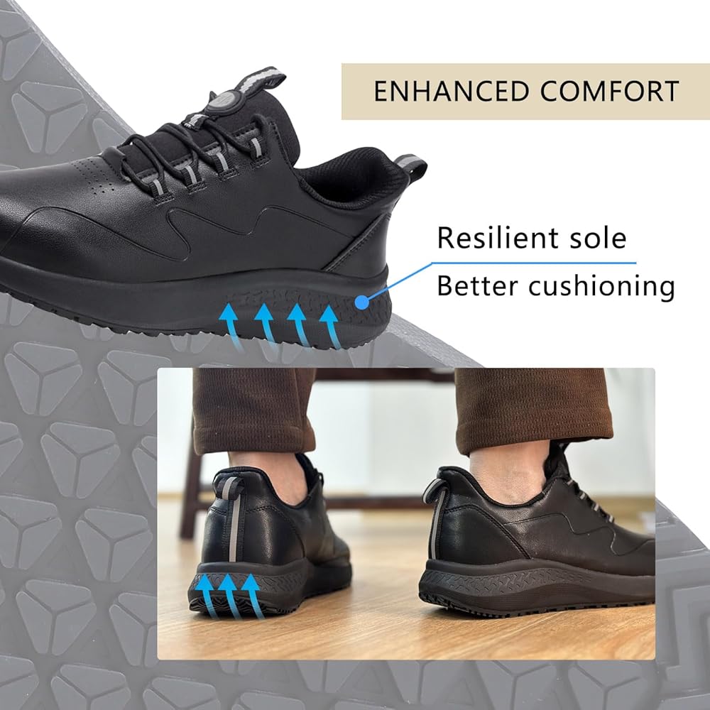 COMFORTABLE NON-SLIP SNEAKERS: These slip-resistant shoes are designed with a soft leather upper and a shock-absorbing sole to enhance comfort. Whether you're standing for long periods or walking frequently, your feet will feel relaxed and at ease. With these shoes, you can prioritize your comfort, allowing you to focus on your tasks without any discomfort or fatigue in your feet.