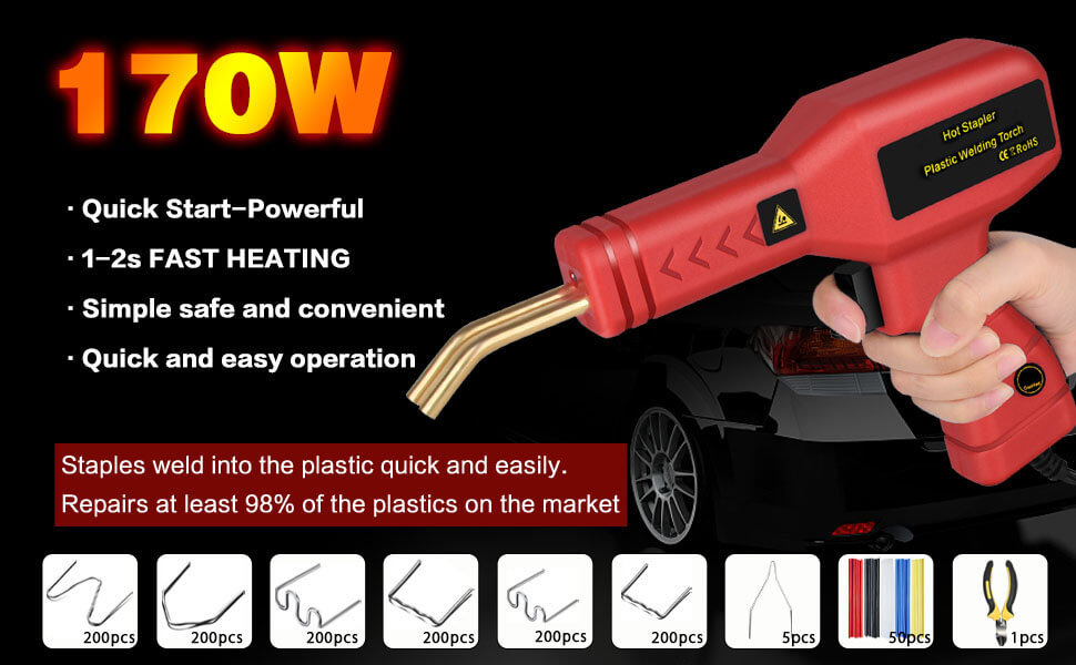γUPGRADED 170W QUICK HEATINGγPlastic Welder has a built-in 170W powerful motor. Higher output current and faster heating speed.Only 1s,Save you timeοΌEasy,fast and simple welding of staples into plastic for a perfect repair.Strong for shock and twist after repairing.Repairs at least 98% of the plastics on the market.such as bumpers,dashboards,lamp holders,plastics rings,and daily plastics supplies.