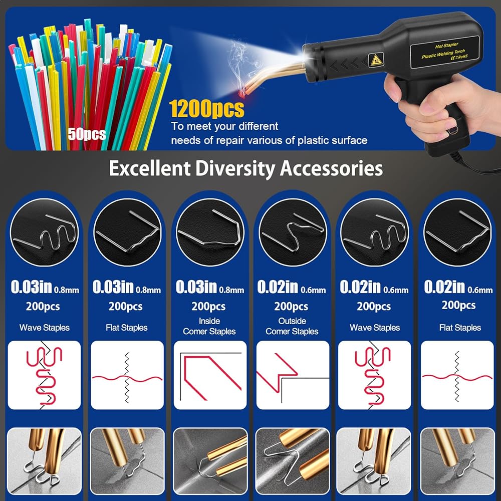 γWHAT YOU WILL GETγ1*plastic welding gun, 1*Carrying Case, 5*welding rod, 1*smoothing head, 1200PCS hot staples (200PCS 0.8mm wave staples, 200PCS 0.8mm flat staples, 100PCS 0.6mm flat staples, 100PCS 0.6mm wave staples, 200PCS 0.6mm M staples and 200PCS 0.8mm V staples) ,5*Smoothing nails, 1*pliers, 1*utility knife,5*sandpapers,1*sanding paper,1*Instruction manual.