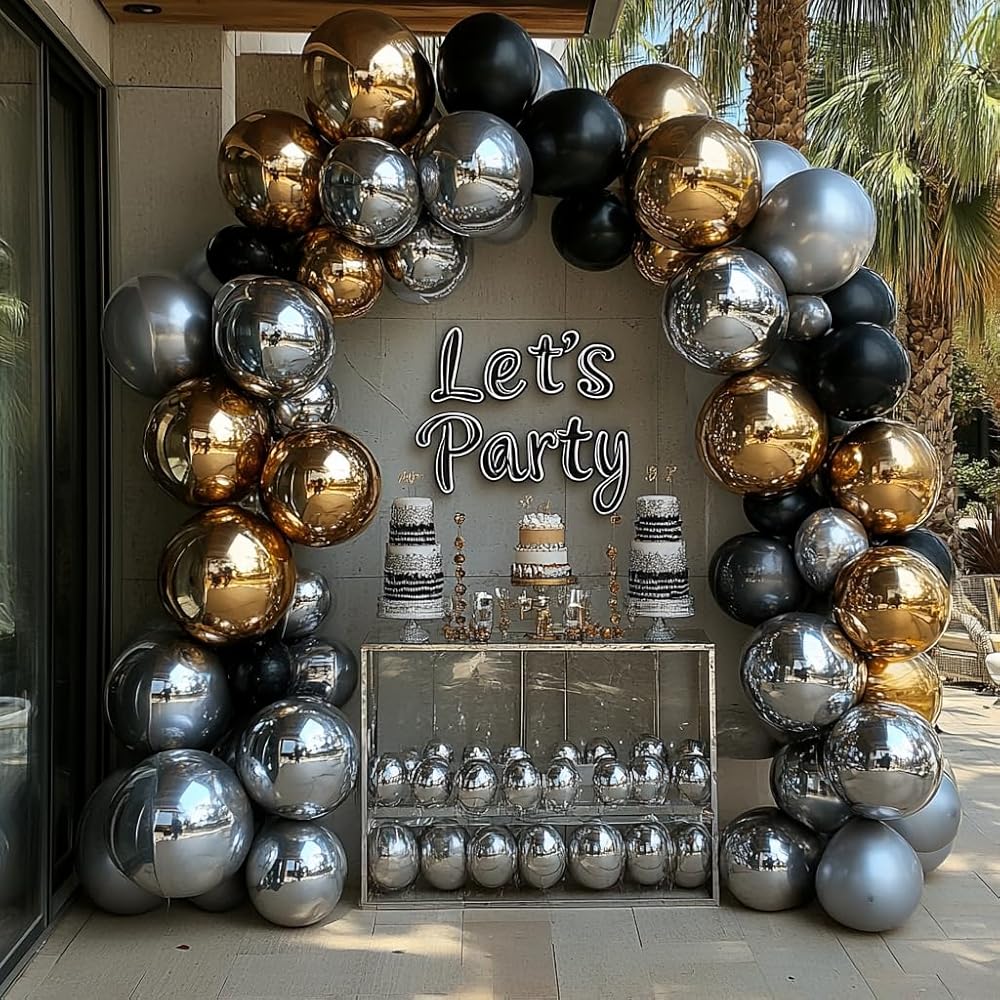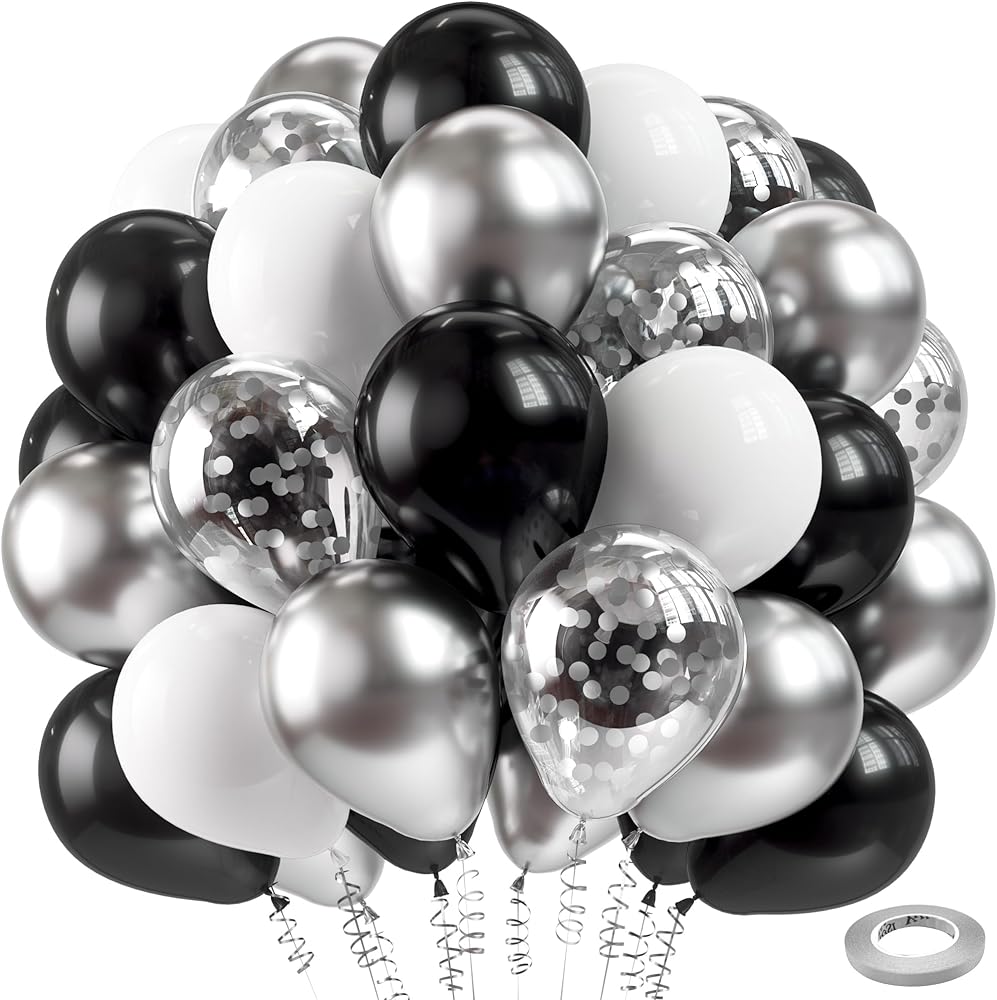 【What You Will Get】- This balloons set including 20pcs black balloons, 20pcs white balloons,10pcs silver chrome metallic balloons, 10pcs silver confetti balloon and 1pcs silver ribbon.