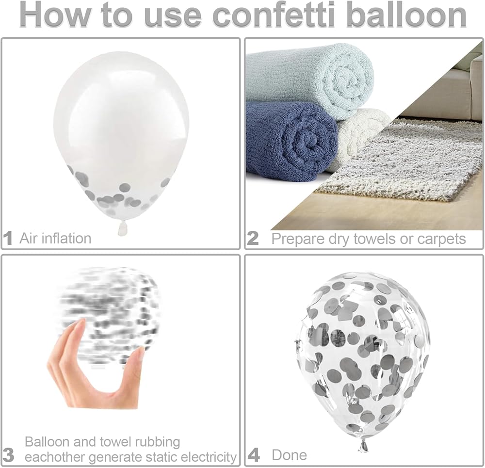 【Tips For Use】- These black white silver latex balloons can be inflate by hydrogen, helium ( it will float more than 12 hours), and air.The best way to rub the surface of the balloons with a dry towel or hair and silk. And it is recommended to use a pump to quickly inflate so that confetti is easier to be stuck.