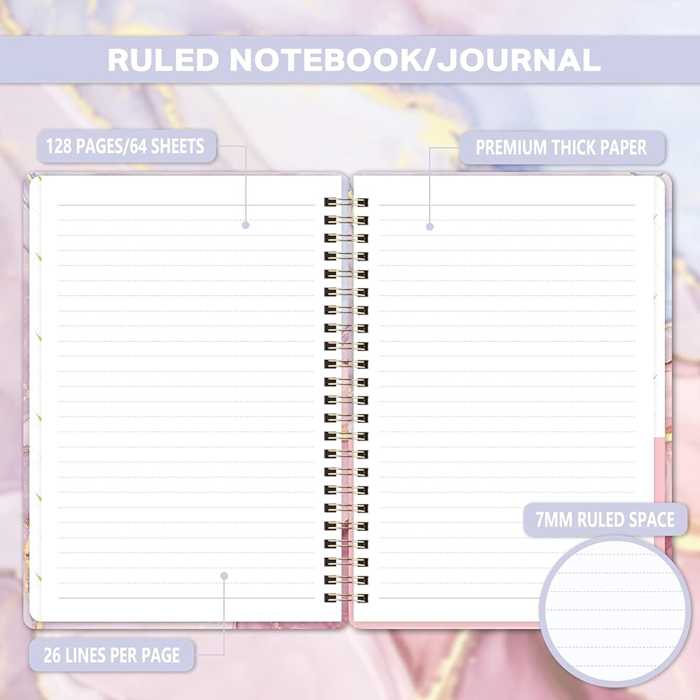 💓Premium Thick Paper - The spiral notebook/journal with 128 pages/64 sheets, 26 lines per page, 0.27 inch per line, you have enough space to record meetings, class notes, inspiration, or draw it into a handbook, so it can be used as office supplies, school supplies, writing, graffiti books.