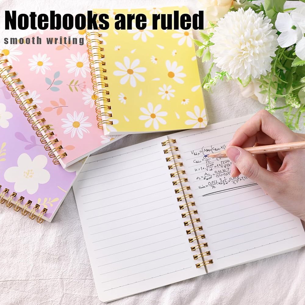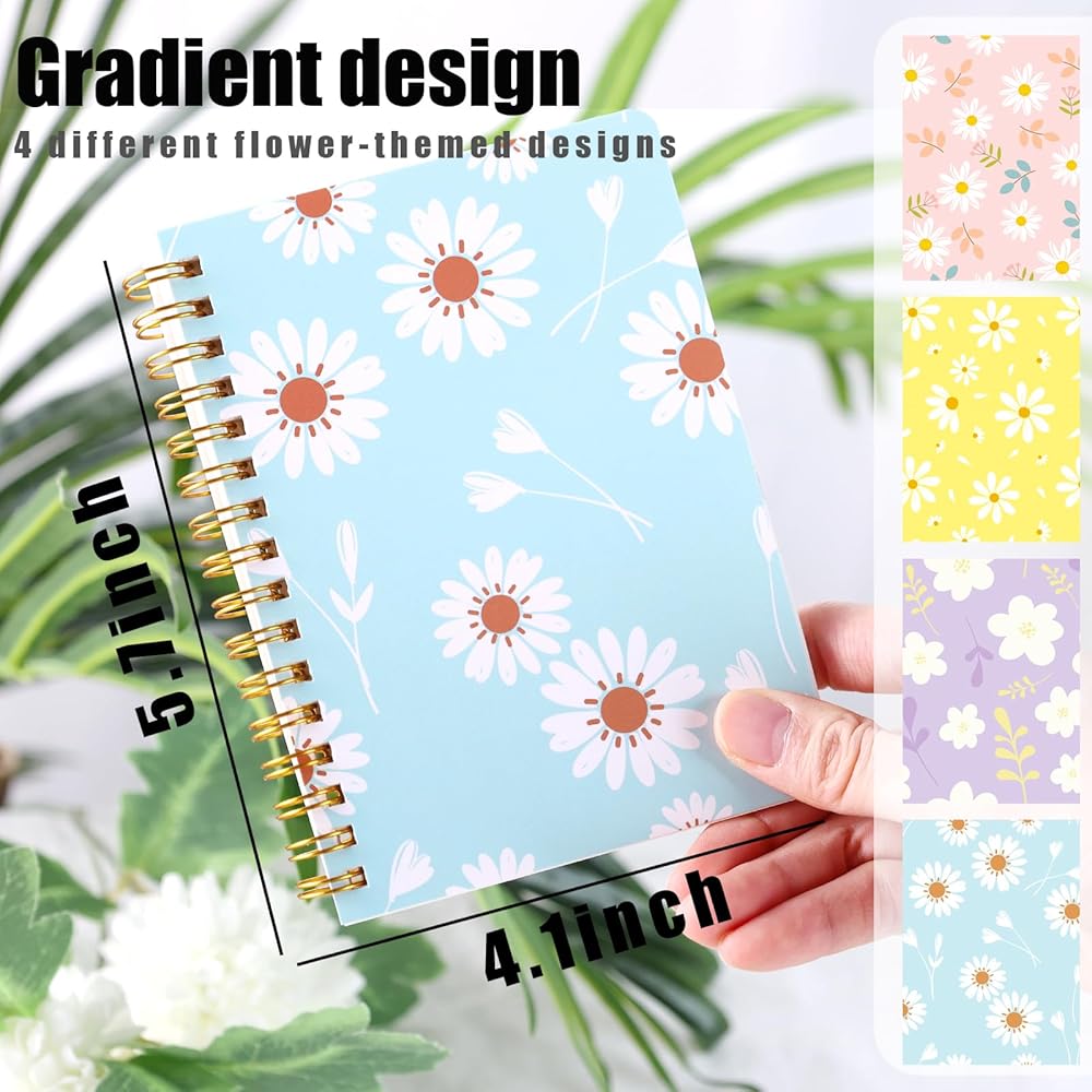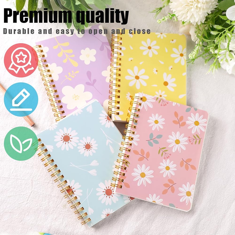 Graceful Designs - Our compact spiral notepads showcase 4 captivating flower-themed designs. These notepads come with refreshing pastel-colored covers adorned with intricately detailed floral patterns, elevating your learning and work experiences with their sophisticated aesthetics.