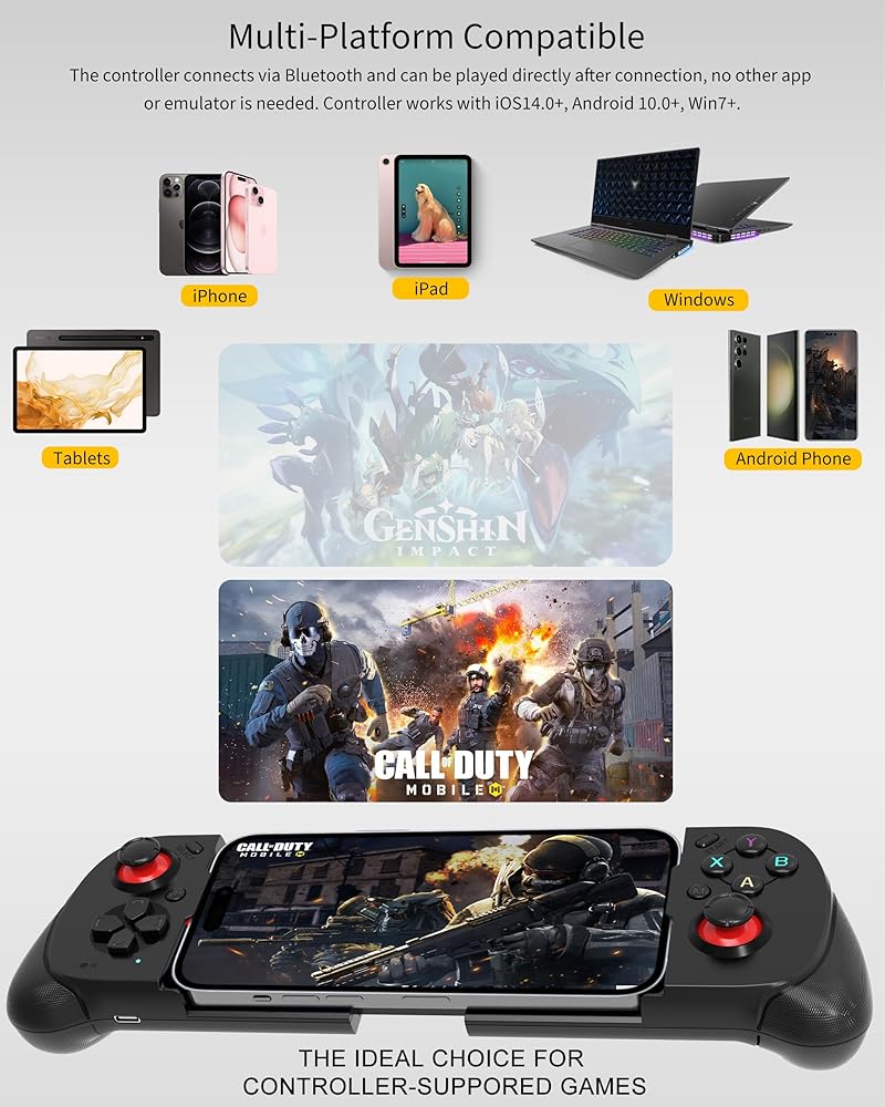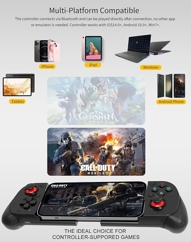 🎮👌【Compatible with iOS 13.0+/Android 10.0+/Win 7-11】 This phone game controller direct Play on iOS and Android phone. Compatible with iPhone 15/iPhone 15 Pro/iPhone 15 Pro Max/iPhone 15 Plus, iPhone 14/13/12/11/8/7/6/SE/XS Series, Galaxy S24/S23/S22/S21/S20 Series, TCL/Huawei/Oppo, and more mobile devices. For PC compatible with all Win 7+ PC that come with Bluetooth, and more.