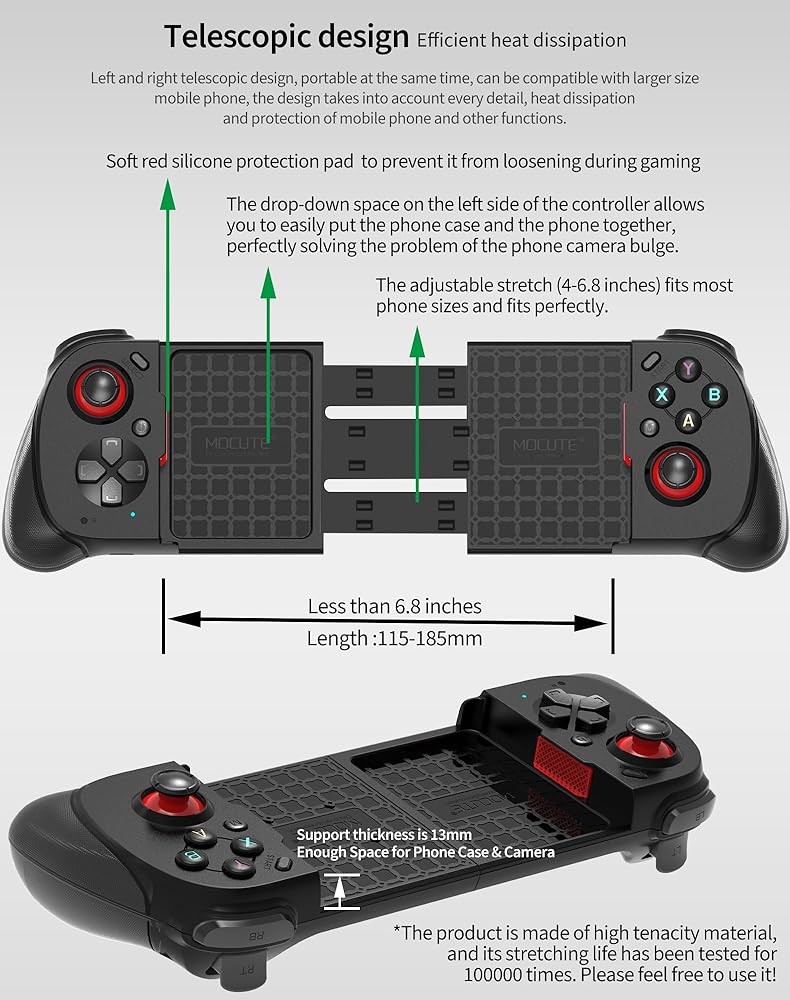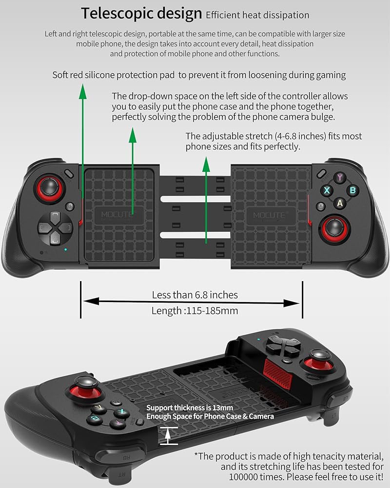 🎮✅【Enough Space for Phone Case & Camera】 The drop-down space on the left side of the wireless mobile game joystick allows you to easily put the phone case and the phone together perfectly solving the problem of the phone camera bulge to prevent it from loosening during gaming. The adjustable stretch (4-6.8 inches) fits most phone sizes and fits perfectly.