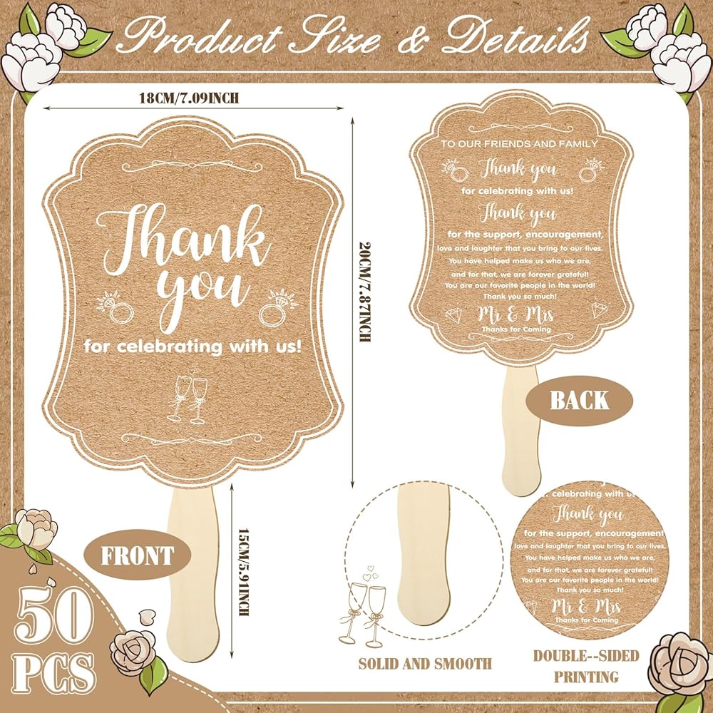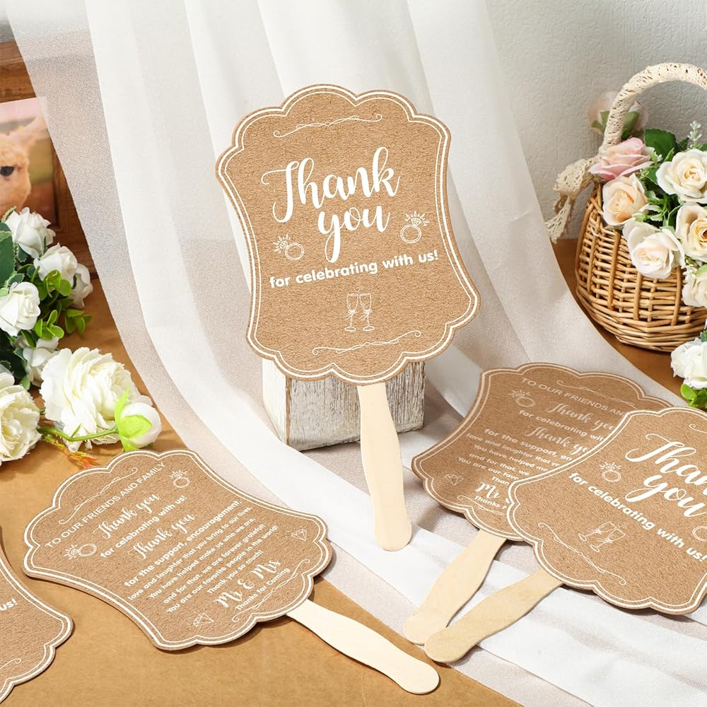 Artistic Kraft Paper Style: featuring a stylish kraft paper design that easily blends with any wedding theme, these wedding fans emanate a harmonious ambiance; And they're designed with double sided printing, allowing your guests to appreciate the beautiful design from any perspective, decorated with warm words, [Thank you for celebrating with us], adding a personal touch and expressing your gratitude to your guests