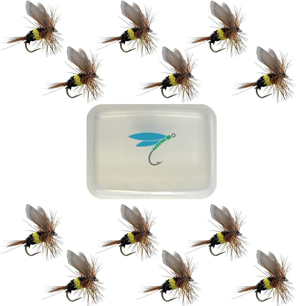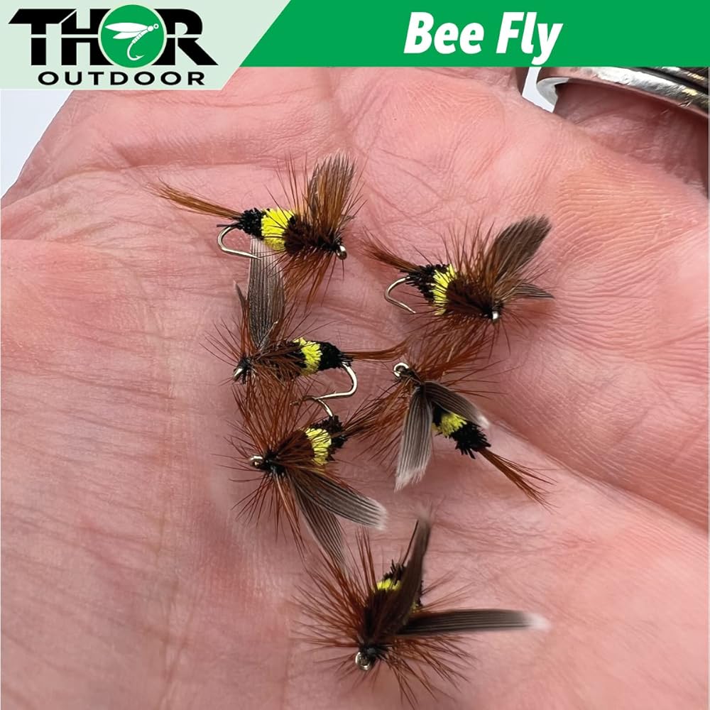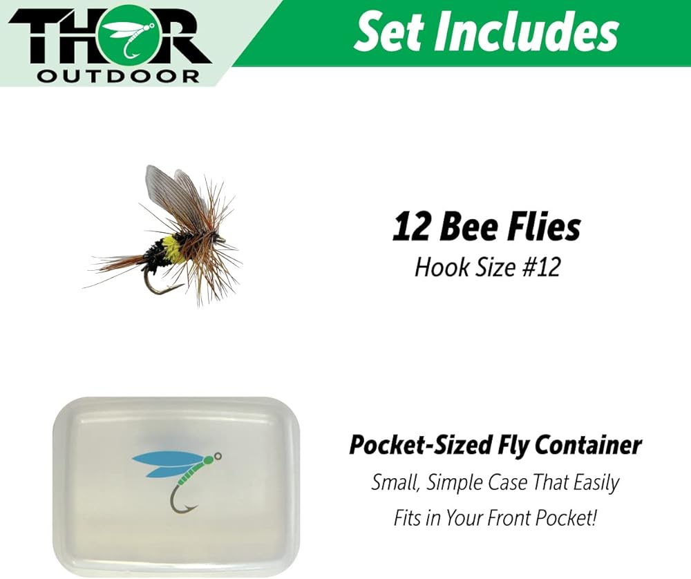 اطلب الان! تشتمل مجموعتك على: 12 Bee Flies - مقاس الخطاف رقم 13 وحقيبة صغيرة تناسب جيبك الأمامي.