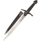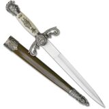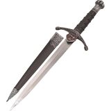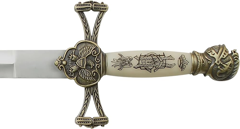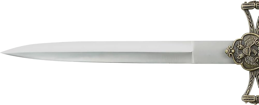 A wonderful collector's item, this bladesusa SW-799 historical short sword features an 14-inch overall length and a double-edged stainless steel blade measuring 7.5 inches. The handle features cast metal furnishings with a brass KNIGHT pommel, and it comes with a matching brown wood scabbard.