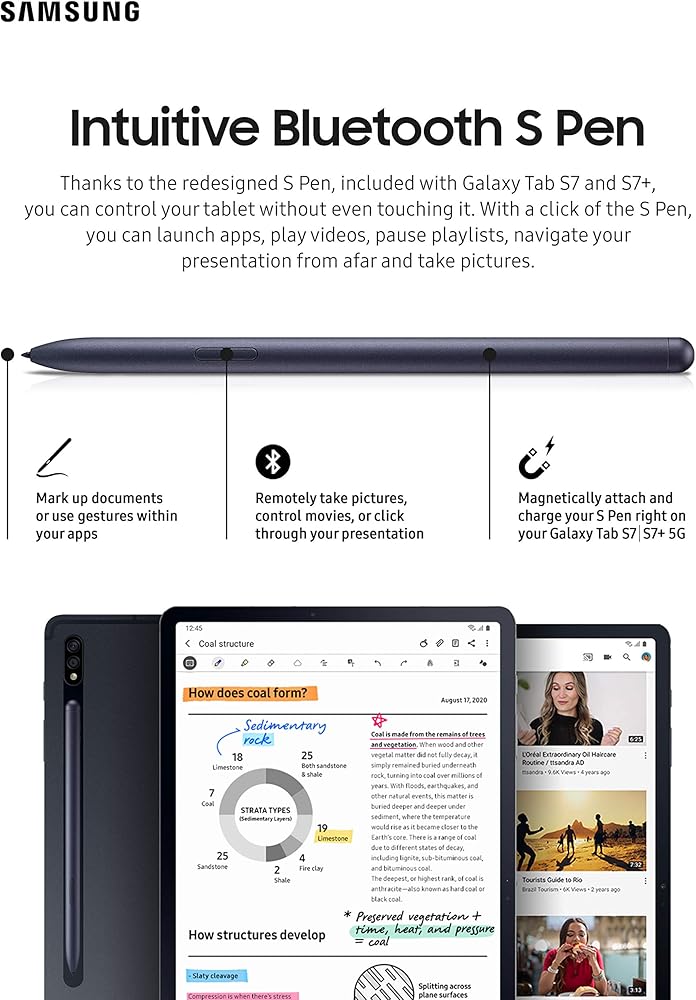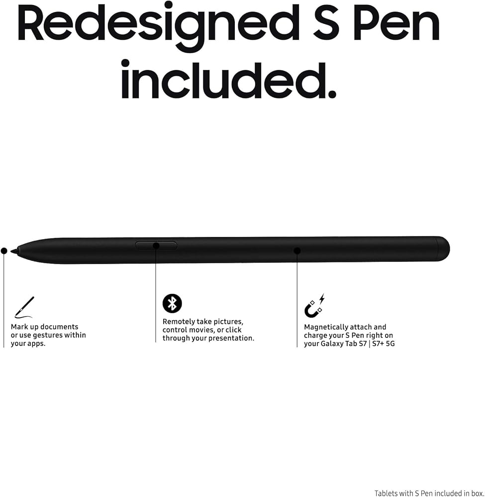 INTUITIVE BLUETOOTH S PEN: Thanks to the redesigned S Pen, included with Galaxy Tab S7 and S7+, you can control your tablet without even touching it. With a click of the S Pen, you can launch apps, play videos, pause playlists, navigate your presentation from afar and take pictures.