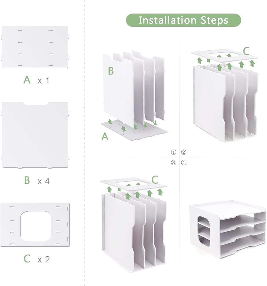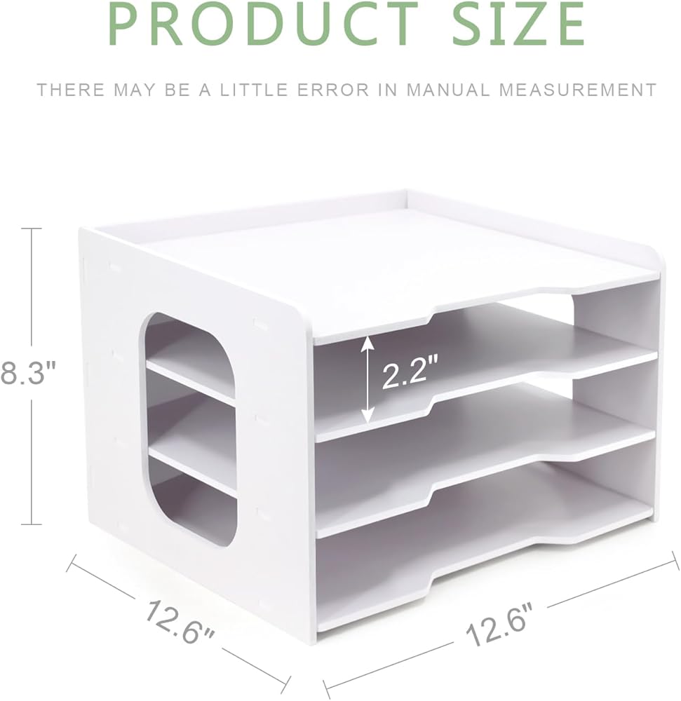 SUTIABLE DIMENSIONS: The assembled file organizer measures about 12.6L x 12.6W x 15.4H (Inch), each compartment layer high 2.2 inch. The white desk organizer has 7 compartments with extra large size, which were designed for paper measuring 12 x 12 inches. Our desk organizer also fits on a shelf or on the floor. It is perfect for home, office and school