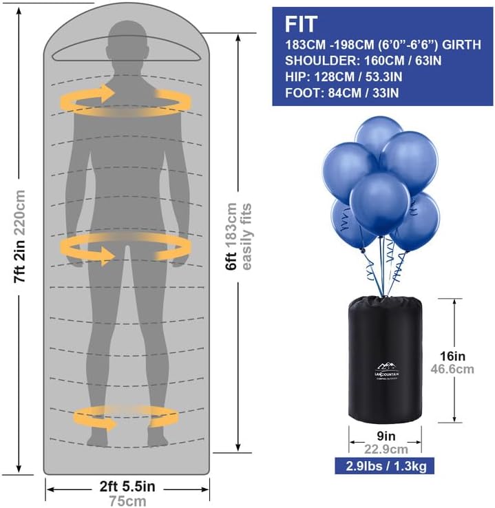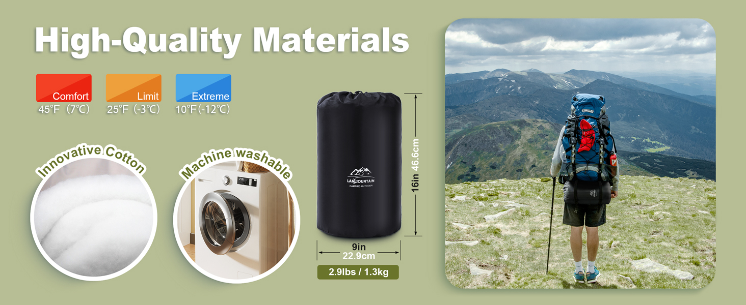 Versatile 3-Season Design: This sleeping bag is designed for use in 3 seasons - spring, summer, and fall. With a temperature range of 10℉ to 45℉, it can keep you warm in cool weather and prevent overheating in warmer conditions. It is perfect for camping, backpacking, hiking, and other outdoor activities.
