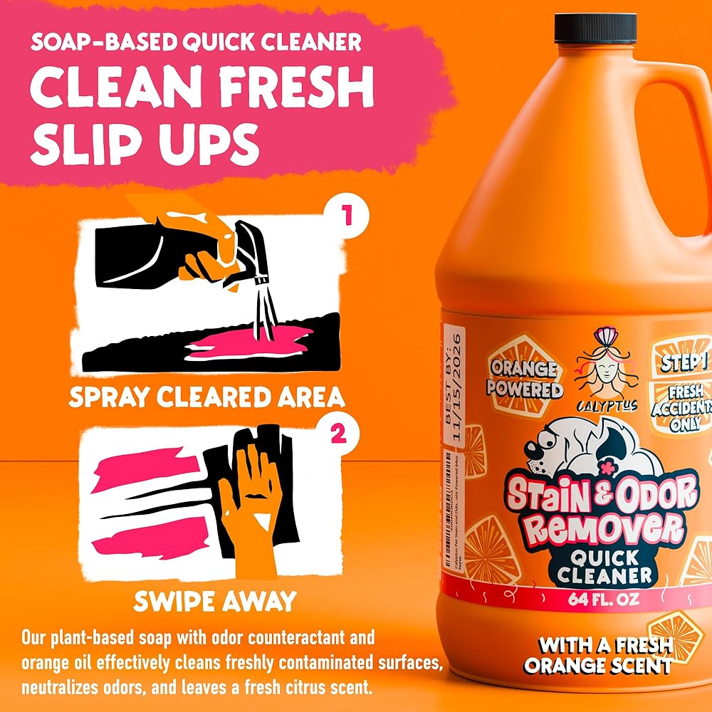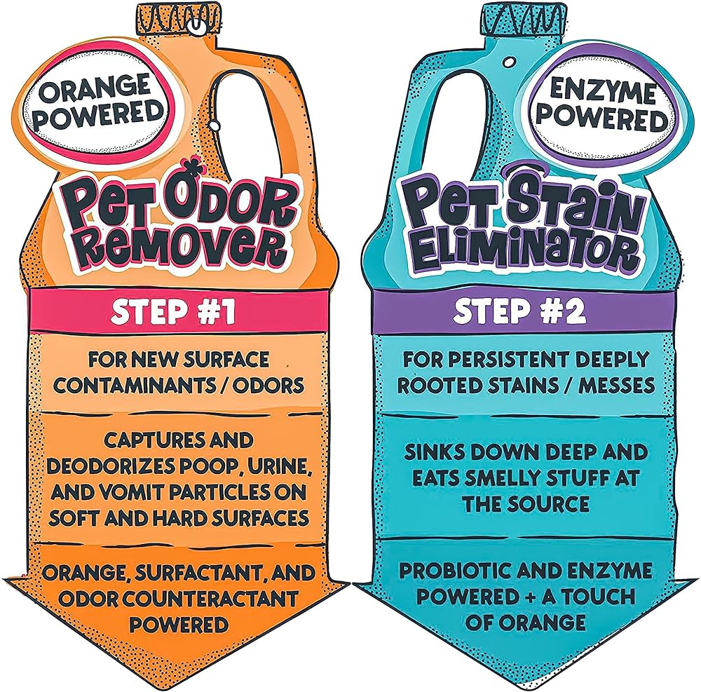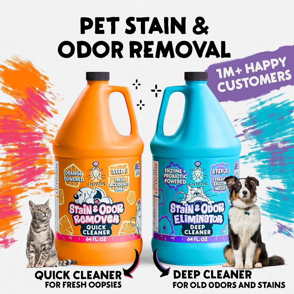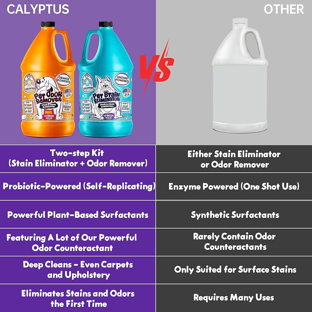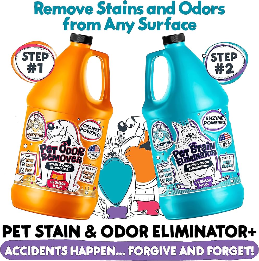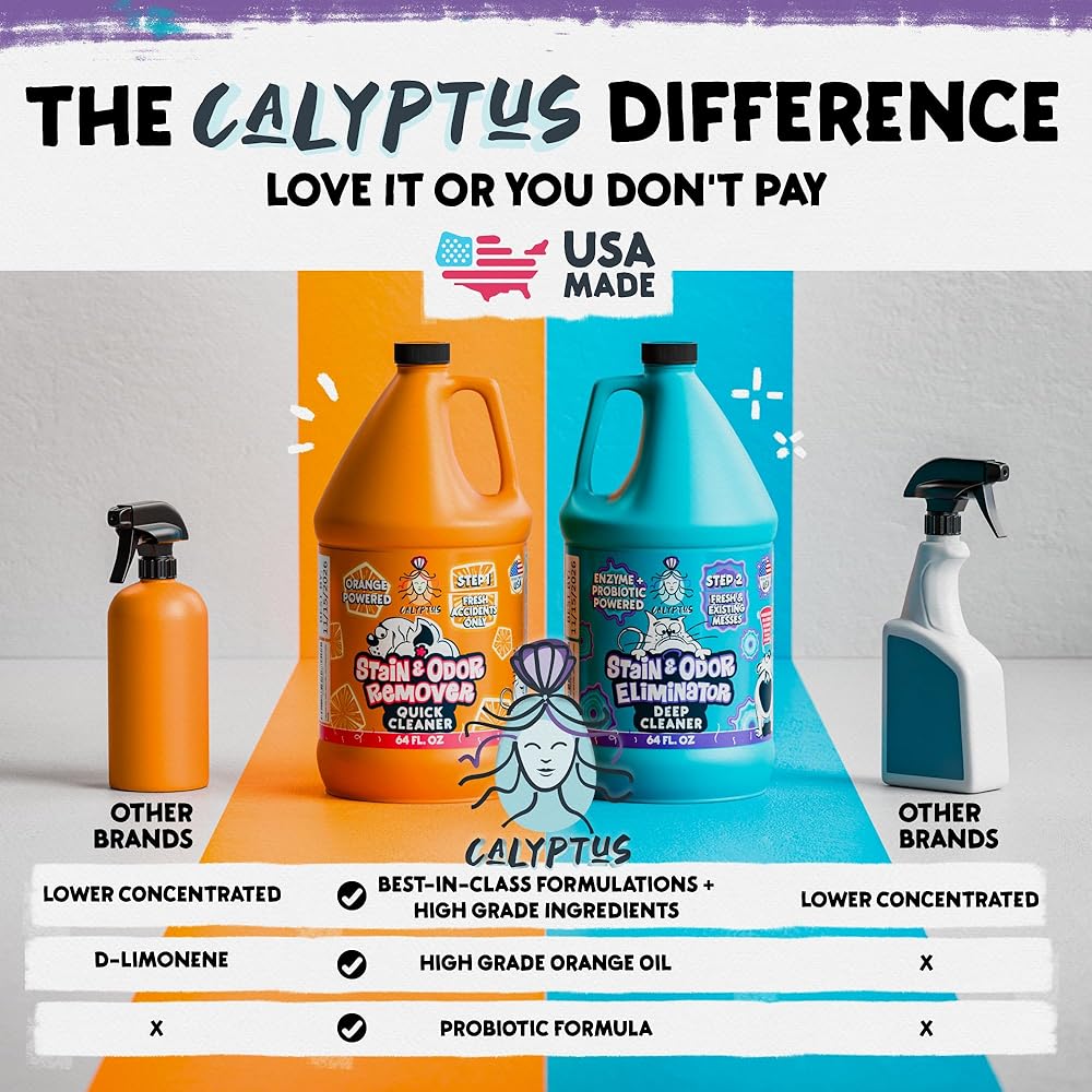Calyptus Pet Stain and Odor Remover | Orange and Enzyme Cleaner Duo Solution for Pets | 128oz (64oz x 2 Bottles) | Carpet Cleaner and Odor Eliminator for Cat Urine, Dog Pee, and Poop | Pro Strength