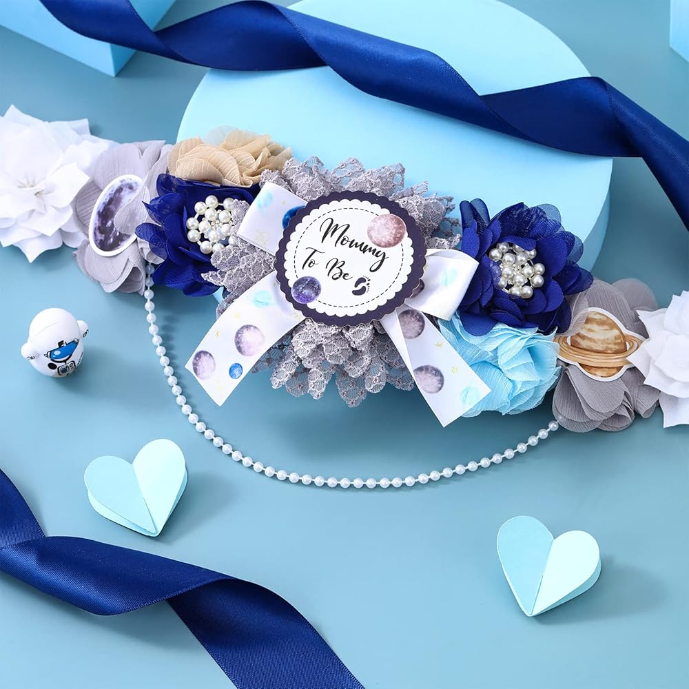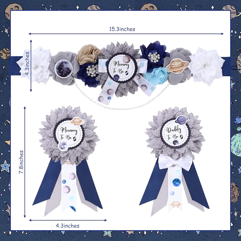 Space Baby Shower Sash - Mom to Be Maternity Flower Belly Belt with Dad to Be Corsage Pin Kit, Galaxy Star Baby Shower Decorations for Universe Gender Reveal Photo Props New Parents Keepsake