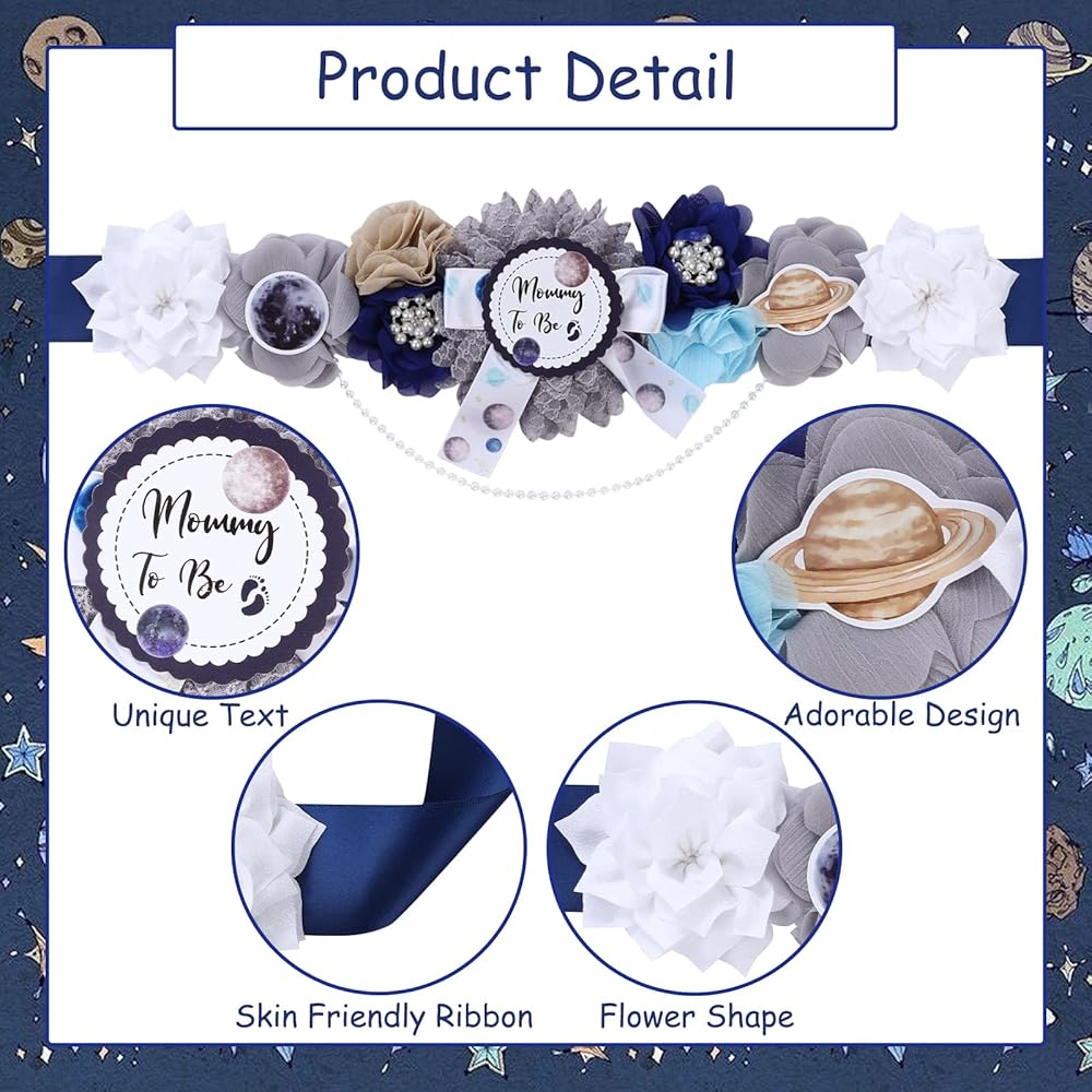【You Will Get】: 1 outer space theme maternity sash, 1 Mommy to be corsage pin and 1 Daddy to be corsage pin.