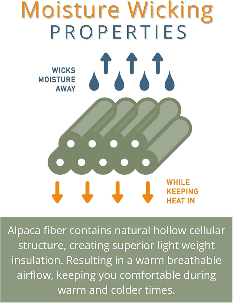 Alpaca fiber is known to be very soft, warm, breathable and light weight due to it's hollow cellular structure. Creating a warm breathable airflow allowing you to be comfortable in warmer temperatures. Alpaca is also known to keep you warm, even if the item is damp.
