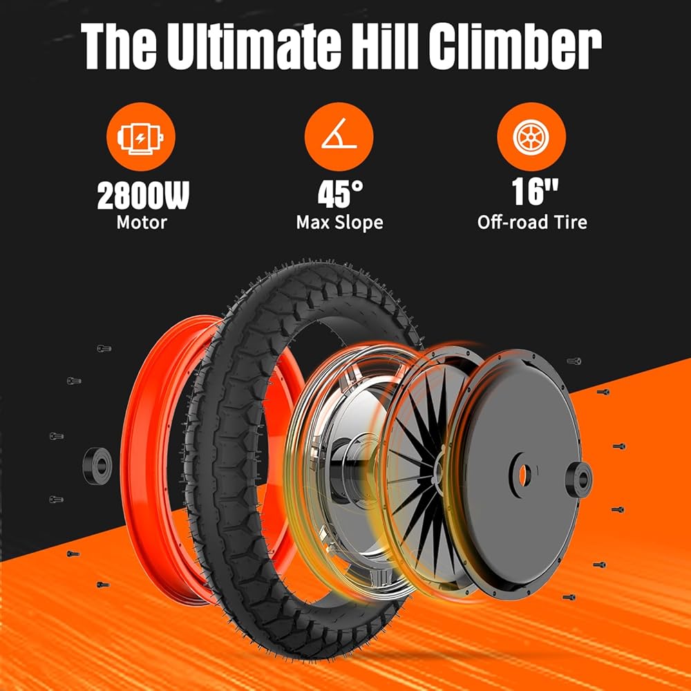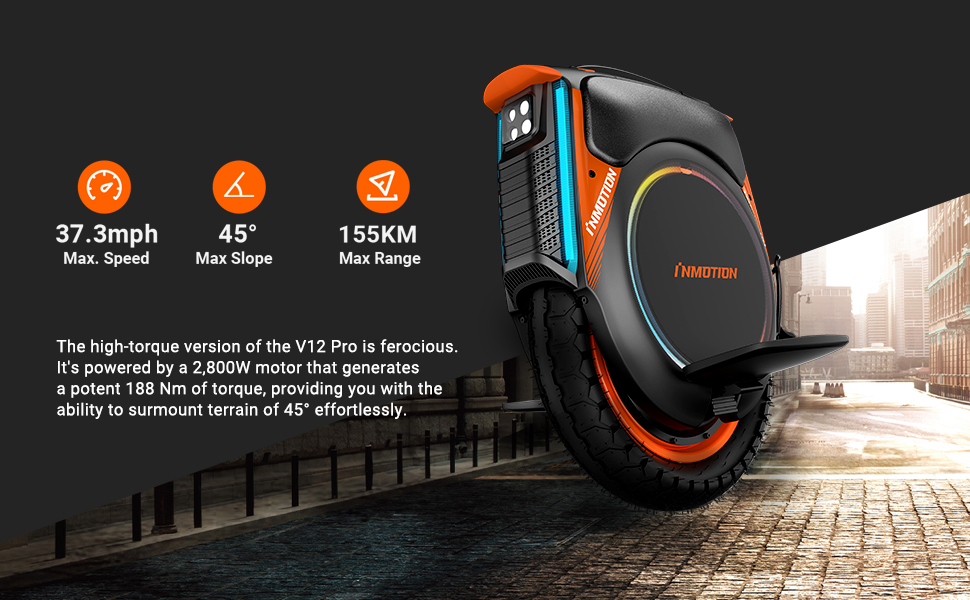 2800W Power Motor: The INMOTION V12 Pro features a powerful 2800W motor capable of generating 160Nm peak torque, allowing easy climbs on 45° slopes. This upgraded electric unicycle promises an exhilarating riding experience