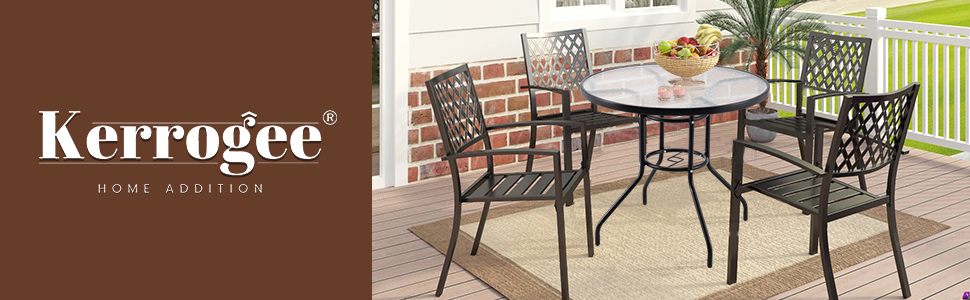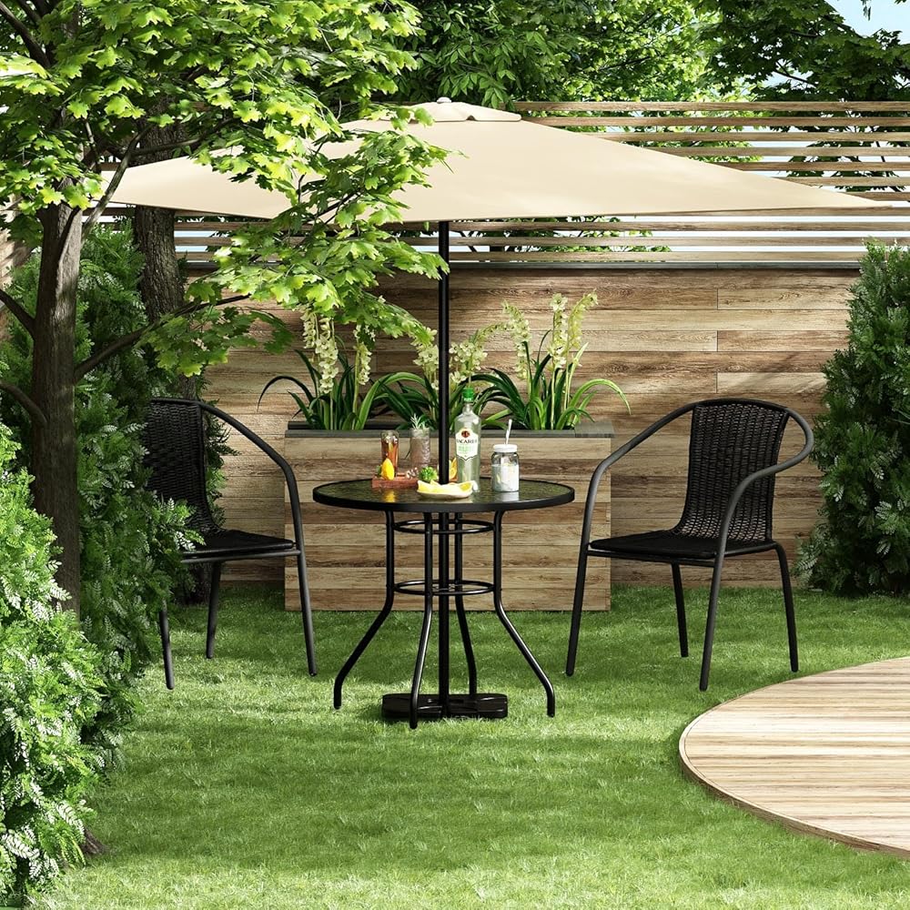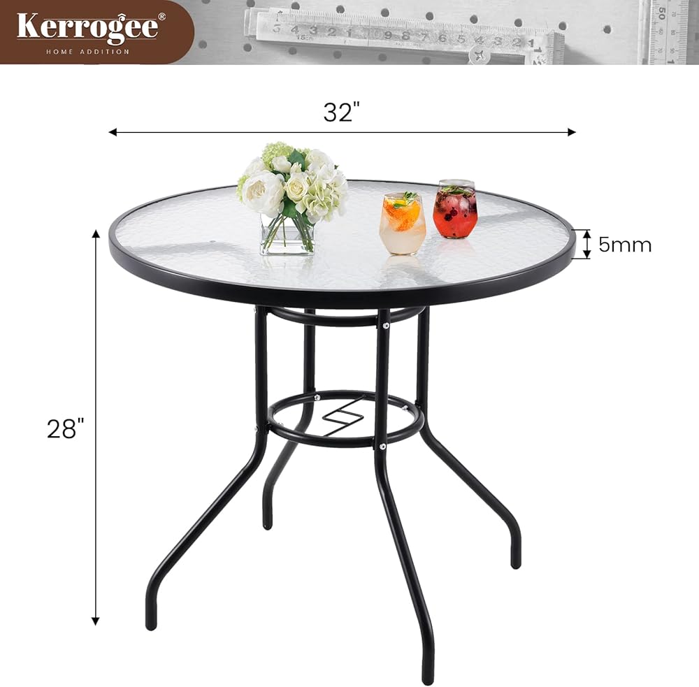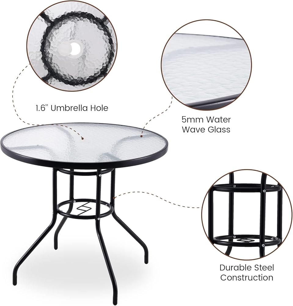 【STURDY & WEATHER RESISTANT MATERIAL】 Our outdoor dining table has thickened 5mm tempered glass, which is sturdy, anti-crack, anti-tarnishing and easy to clean. The black powder-coated steel frame makes the table strong enough that can hold up to 130 lbs and won't be blown away. It is rust, weather and scratch resistant, and can be used long term no matter it is indoors or outdoors, sunny or rainy days.