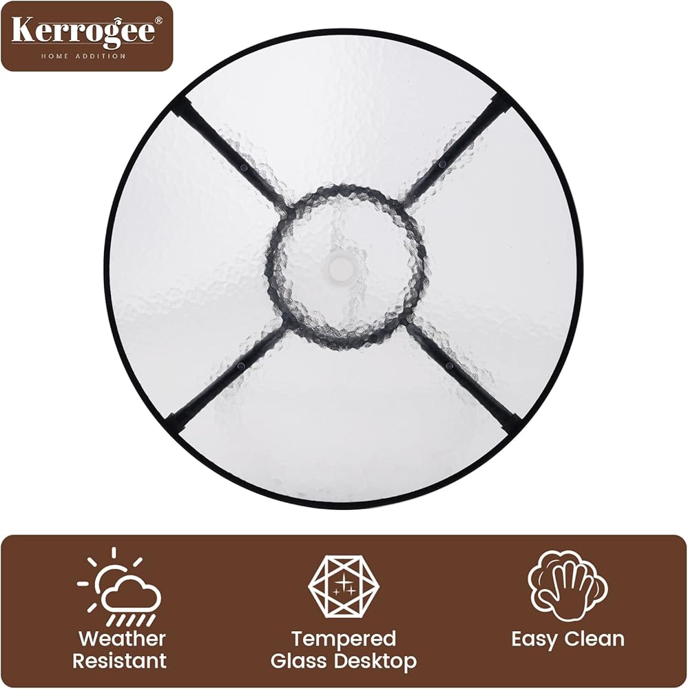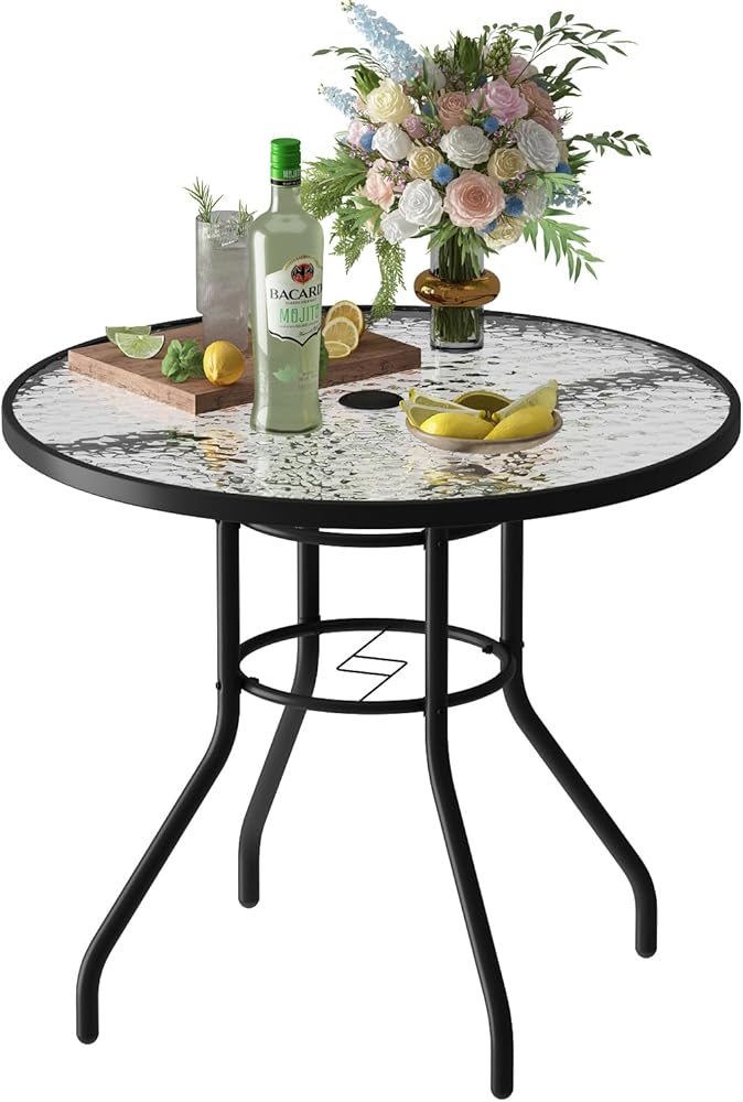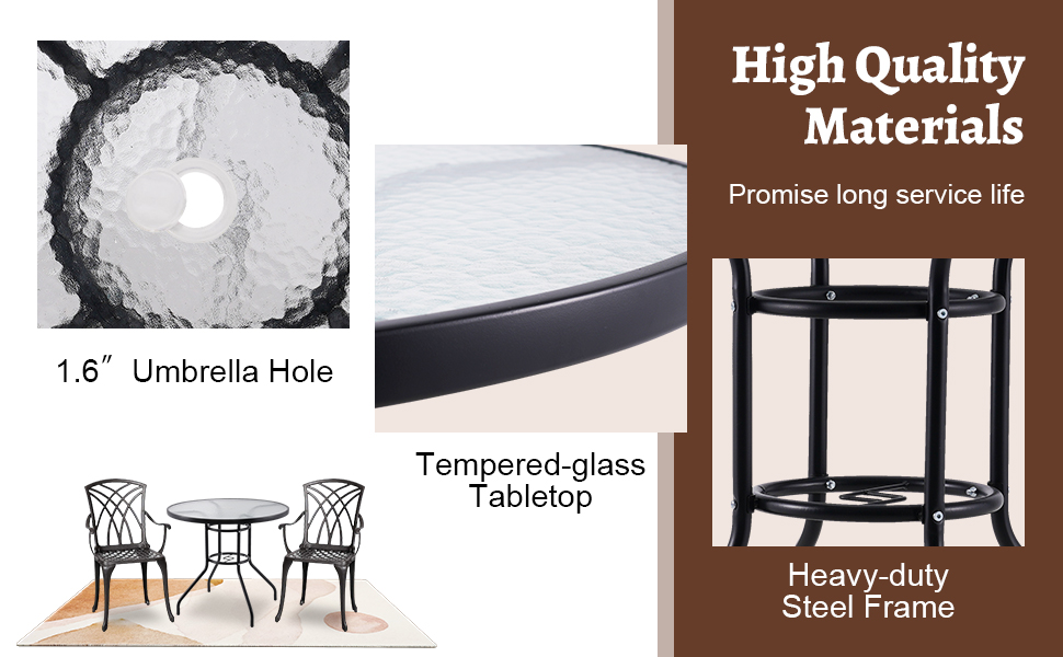 【ADDITIONAL UMBRELLA HOLE】 Our outdoor glass patio table has a 1.6'' umbrella hole, fitting most patio umbrella, which not only saves your space but also increases aesthetics of your space. The bottom frame with hole can help fix the umbrella handle to making both the patio table and umbrella stable. You can put the lid on the hole when not using umbrella.