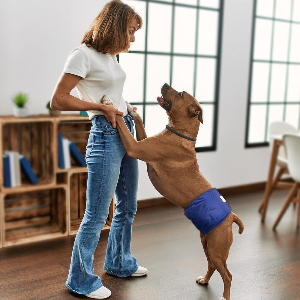 Easy to wear- Hook & Loop closures are quick and easy to secure and won't stick to your pet's fur. These soft doggy diapers help your pet keep clean and dry between walks. Elastic edges provide extra fixed and snug fit around the waist, belly bands for male dogs will not slip off no matter how much wriggling and moving. With attractive and cute designs, your dog is fashion enough when you go out taking a happy time.