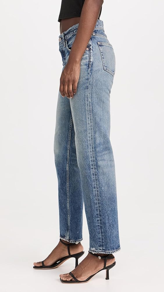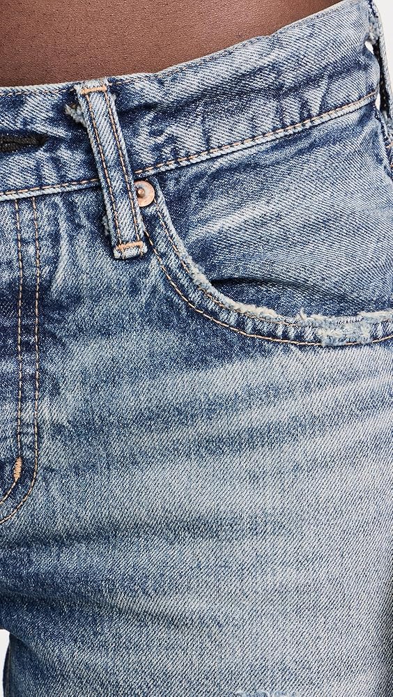 Runs true to size. , Designed with a low rise and a straight leg. Jeans offer a roomy fit at the back waistband. Denim has no stretch and may feel snug initially, but will soften and give with regular wear.