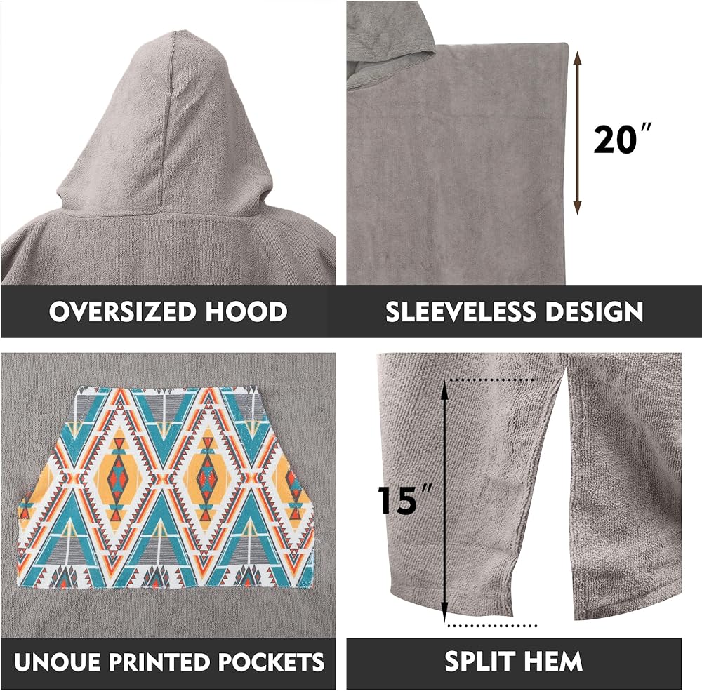 Rainleaf Surf Poncho Changing Towel Quick Dry Pool Swim Beach Towel with Hood and Front Pocket Warm and Soft Microfiber RobeTowel for Women and Men Light Gray Geometric Pocket