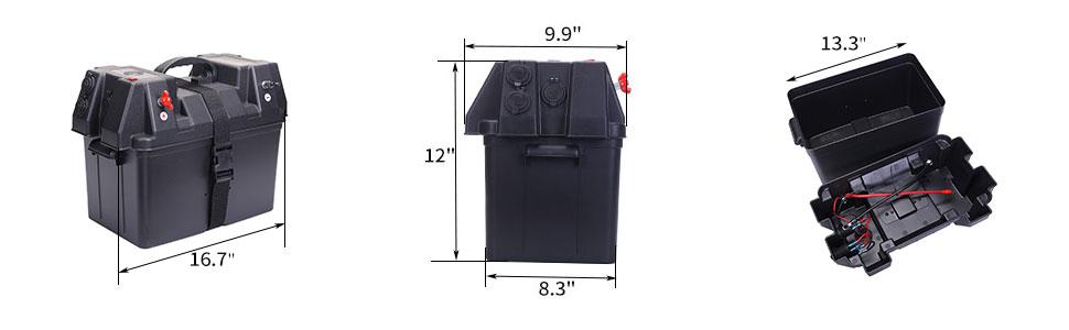 PRODUCT SIZE: 16.7'' x 12'' x 9.9". The Inner Size: 13.3” x 8.6” x 8.1”. Designed to fit group 24- and 27-size batteries.