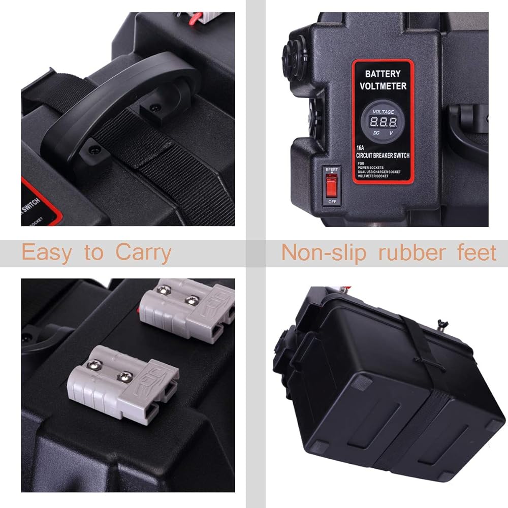 PERFECT DESIGN: Non-slip rubber feet - non-slip feet keep your battery box stay in its place; Sturdy strap - ergonomically designed for easy carrying. Hard plastic is not easy to be broken, windproof, rainproof, dust-proof. Warning: use side handles to carry when battery inside, not top one
