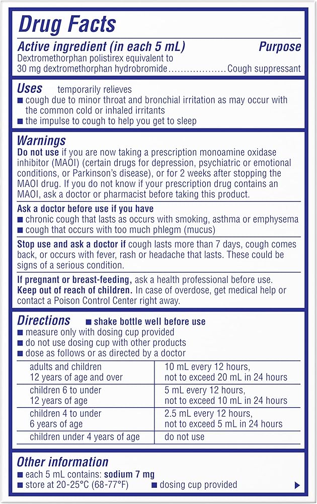 Active Ingredient (in each 5 mL dose). Dextromethorphan polistirex equivalent to 30 milligrams dextromethorphan HBr