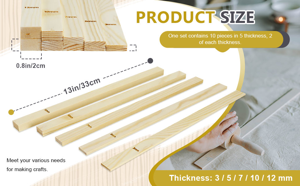 Size: Each clay rolling pin guide is 13 x 0.8 inches / 33 x 2 cm in size and comes in 5 different thicknesses of 0.12 inch, 0.2 inch, 0.28 inch, 0.39 inch and 0.47 inch to meet your various needs for making crafts. You can choose the right size according to your needs.