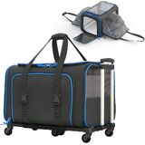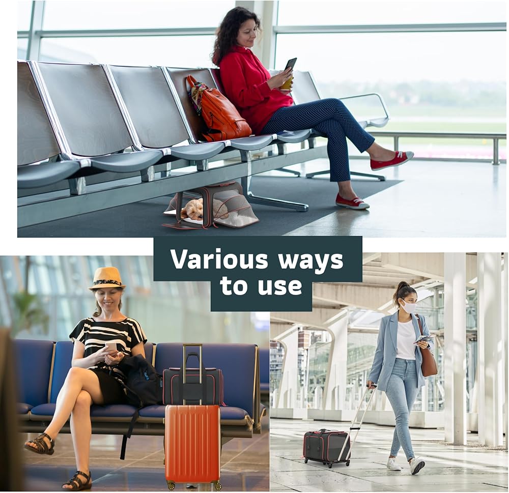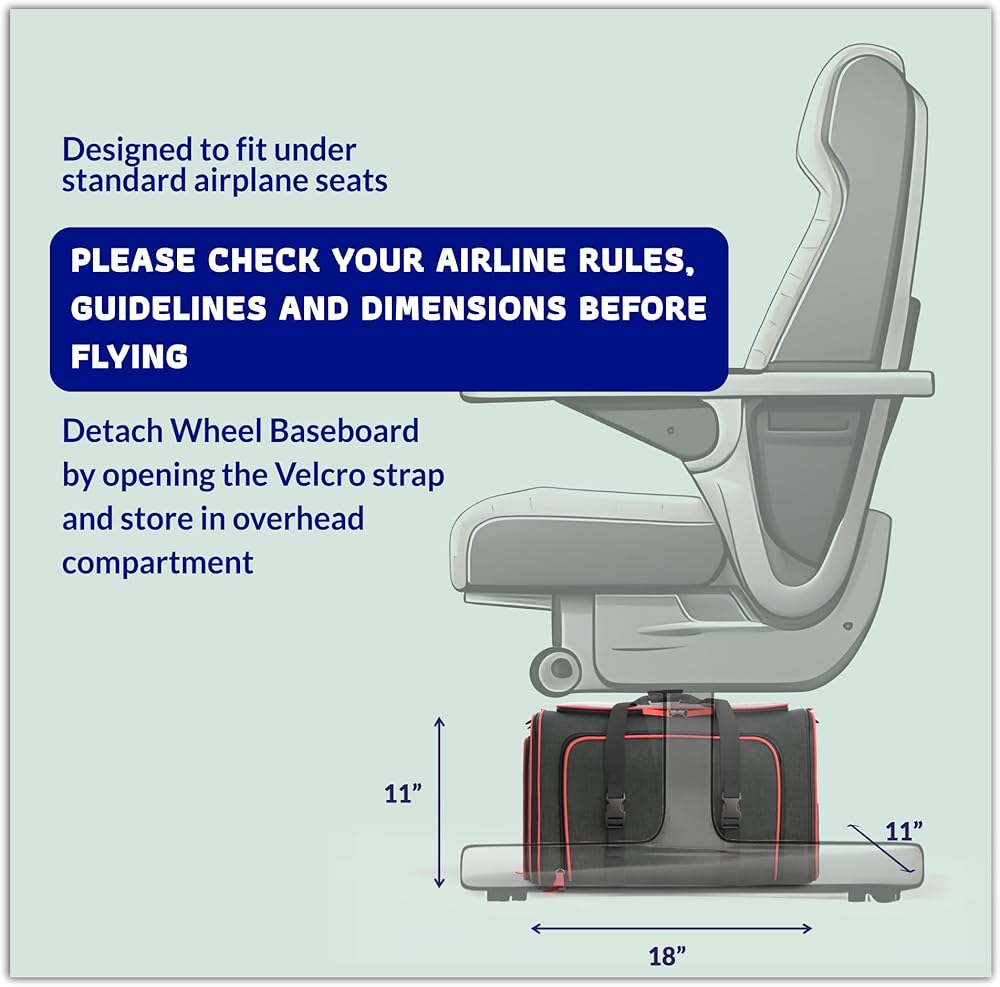 Offering a spacious 2 sided expandable wall, open feel with mesh top and expandable side windows for ultimate breathability and visibility, the Rolling Rover is perfect for pets who love to observe their surroundings and feel like they're part of the action! The Roling Rover is designed for all types of travel including airplane flights, road trips in the car, and long public transportation routes. Use it with or without wheels and make your next adventure your best adventure with your best animal friend! FEATURES & BENEFITS: Removable Wheelbase Easy Swivel Rubberized Wheels x 6 Soft Sided Pet Carrier Double Telescopic Hand Washable Plush Bed Inner Safety Leash Hook Zippered + Storage Pockets Comfort Strap Handle Soft SIDED COZINESS The soft-sided design and plush fleece bed create a cozy microenvironment for your pet and guarantee their maximum comfort during extended travel times. Use the Rolling Rover for cats, small dog breeds, and other small pets like rabbits, ferrets, and chinchillas. Katziela carriers are airline Compliant for domestic travel as a carry-on bag and can easily fit underneath your seat for the duration of the flight. Lightweight and easy to carry with a padded comfort grip handle. REMOVABLE 6 x Wheelbase Convert the Rolling Rover from a rolling pet carrier to a wheelless carrier and back again by removing the wheelbase. Great for when you need to fit in tighter areas. The double telescopic handle allows for pinpoint maneuvering and is not hidden but remains easily accessible in an upright or 45-degree angle position. The handle folds into the carrier and all the way down, along with the wheels. SPECS: Outer Fabric: 85% Polyester / 15% PVCMesh: 80% Nylon / 20% PolyesterTrim: 100% PolyesterFoam: 100% EPELiner, Webbing, Fleece Pad: 100% PolyesterZipper: 100% Nylon